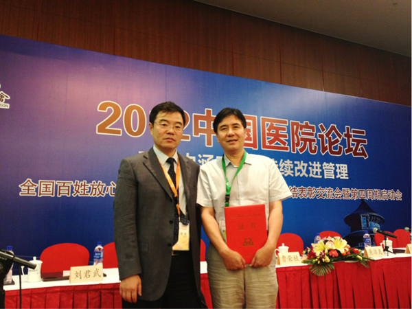 我院自2002年开始创建全国百姓放心医院,连续3年经过明明白白看病、医疗优质高效、绿色医疗环境等三个主题的创建和检查验收,于2004年被授予首批“全国百姓放心医院”称号。2006年我院成功创建为首批“全国百姓放心示范医院”。2007年起,中国医院协会开始对607所全国百姓放心示范医院开展动态,每两年为一个动态管理周期,我院每个动态管理周期都以良好的医疗质量、服务和医院管理顺利通过评审。2012年,中国医院协会在全国范围内评选了137家“全国百姓放心百佳示范医院”,我院在全国众多的医院中脱颖而出,荣获殊荣。时任副院长余勤代表我院,并作为全国获此殊荣的医院代表之一上台领奖。