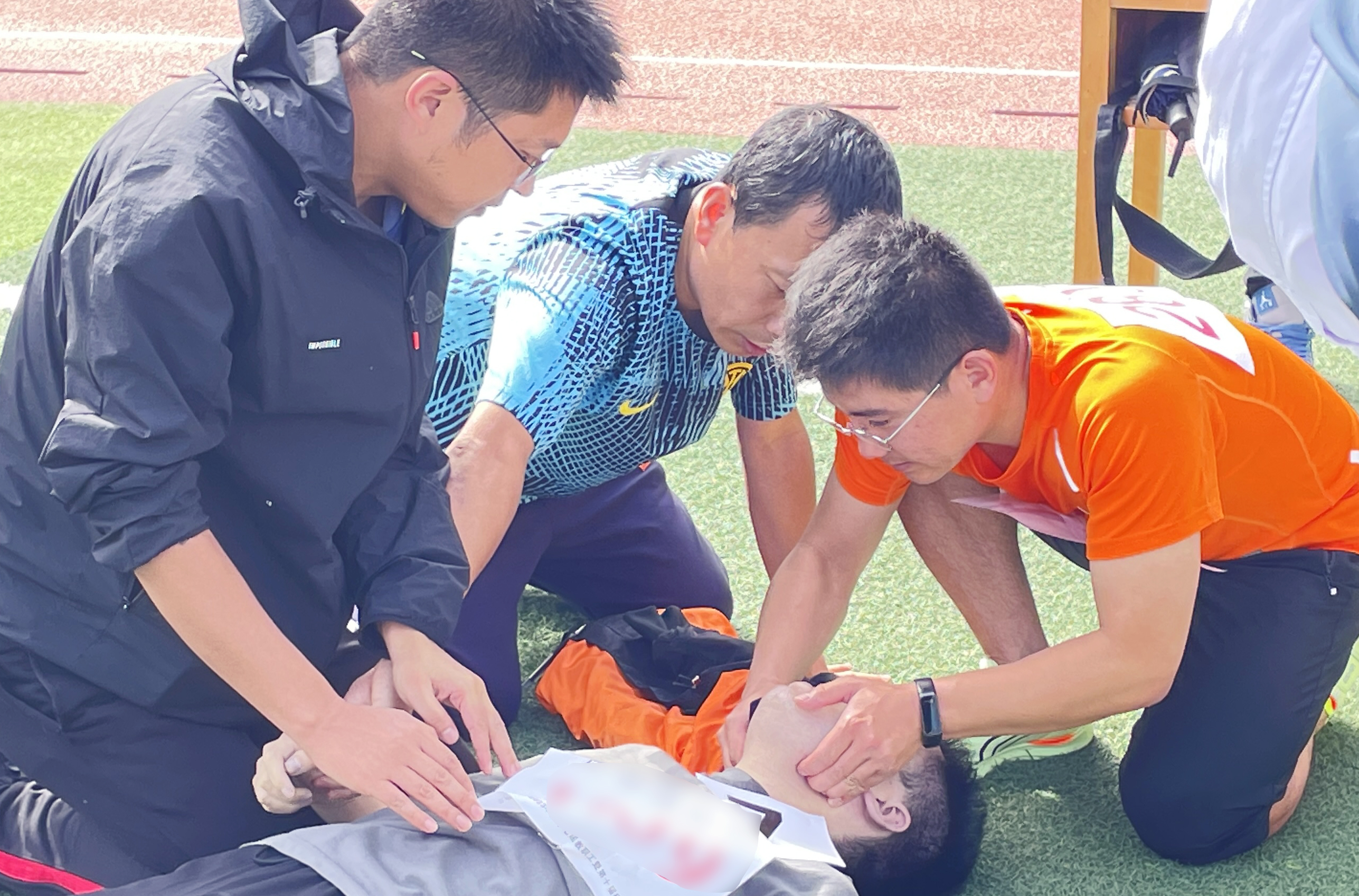 当日下午,兰州大学教职工运动会男子3000米青年组比赛刚刚结束,不远处传来一声惊呼:“快来人,有人晕倒了!”。伴随着呼声,有一名刚刚参加完该项目的运动员晕倒在地,不省人事。正在附近休整的兰大一院代表队医护人员第一时间奔向了患者,发现此时患者口唇发绀、全身青紫、意识不清、瞳孔散大,没有自主呼吸和心跳了。情急时刻,兰大一院神经外科杨刚医师迅速与呼吸科鲁文强医师、放射科王寅中医师及刚跑完3000米的介入科李更相医师、重症医学科二病区护士冯鑫组成抢救小组,开展现场抢救工作,并安排相关人员通知运动场外提供保障的校医院医护人员提供氧气等抢救物资支持。