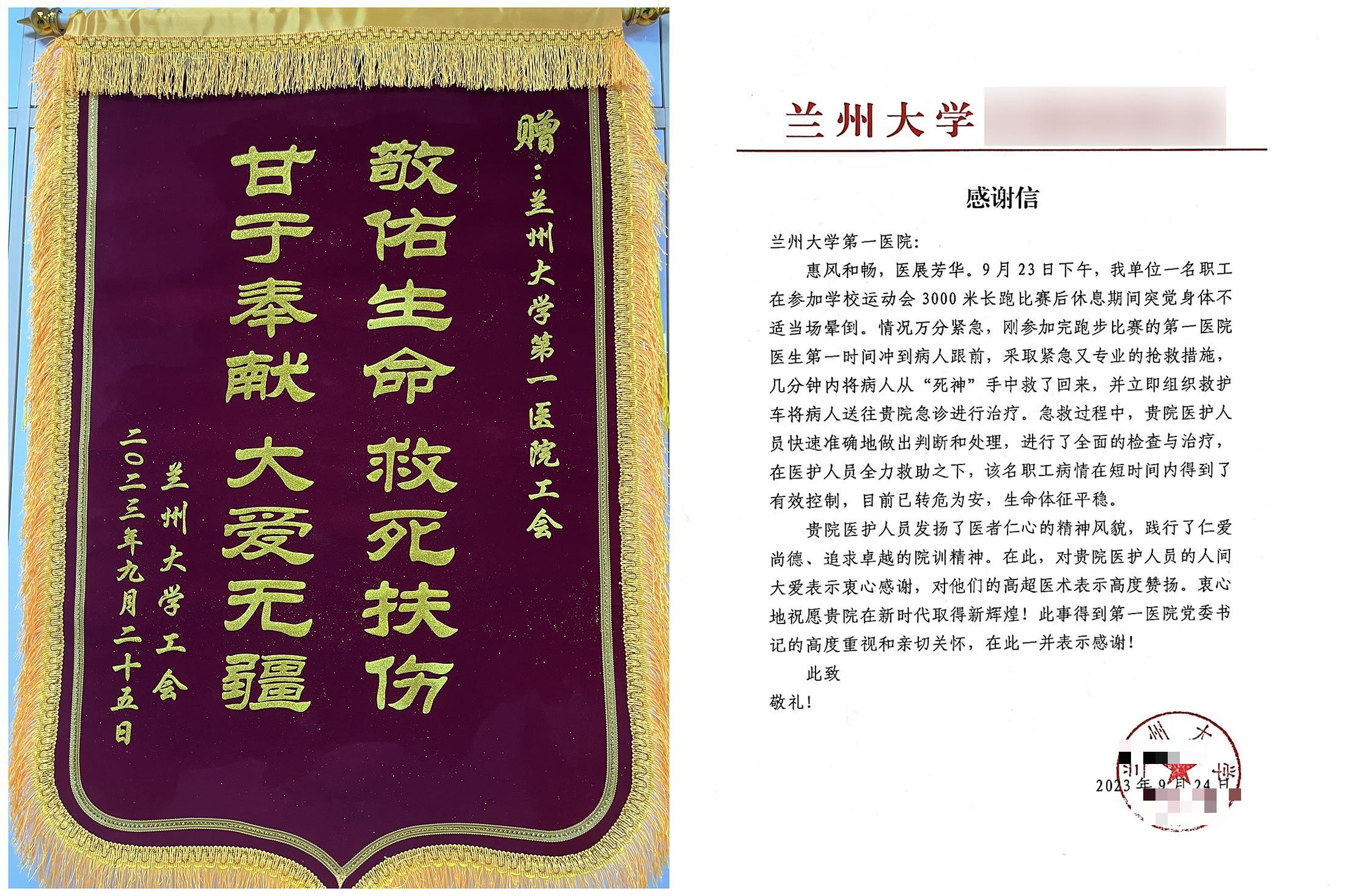 9月25日、26日,兰州大学工会与该同事所在部门的相关领导分别专程送来感谢信、锦旗和鲜花,向医院、院工会及参与急救的医护人员表达了感谢,并为兰大一院医护人员能够第一时间冷静判断,准确开展“教科书式”急救的水平点赞。