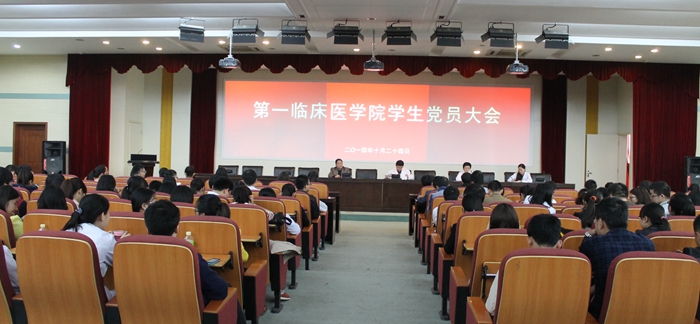 2014年10月24日下午,第一临床医学院召开学生党员大会,学生党总支书记、总支委员、各学生支部书记、相关教学管理老师和学院全体学生党员、预备党员、入党积极分子400余人参加会议,会议由学生党总支书记郭鹏军主持。