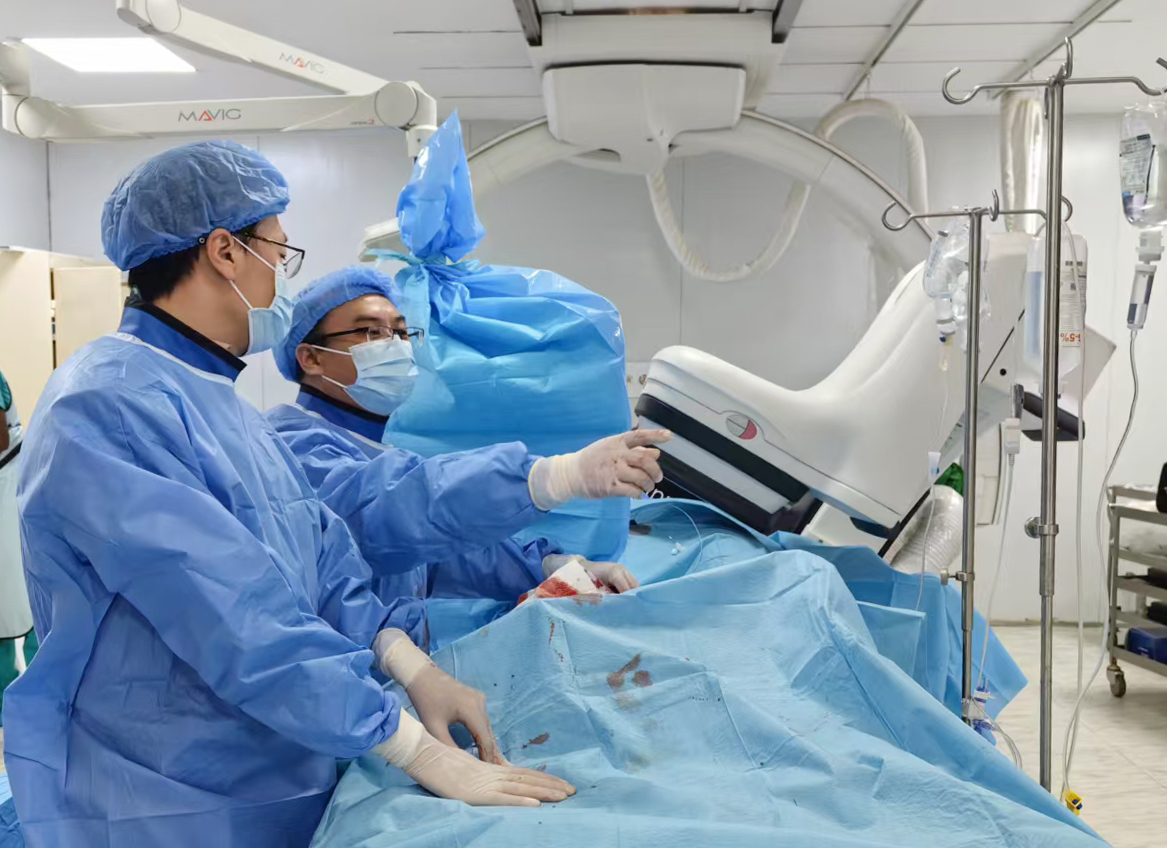 对于介入医学科副主任医师铁镔而言,这一年的挑战尤为艰巨。布基纳法索全国没有一名介入医生,更缺乏配套器械与耗材,介入医学仍处于空白状态。抵达后,他立即与各临床科室沟通,筹集器械,调试设备,制定手术流程。
