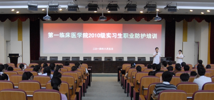 2014年8月5日上午,临床教务处组织2010级全体实习生在我院营养楼第一学术报告厅进行职业防护培训。学生管理科副科长张莉主持本次培训。