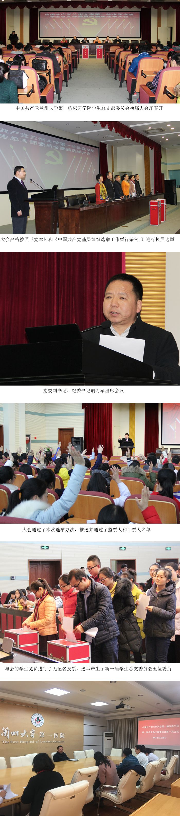 2016年12月26日,中国共产党兰州大学第一临床医学院学生总支部委员会换届大会在营养楼四楼第一学术厅召开。党委副书记、纪委书记胡万军出席会议。会议由学生党总支书记郭鹏军主持。