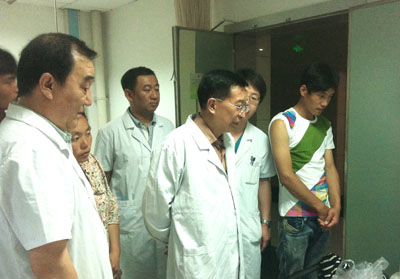 7月24日晚21:40,甘肃省卫生厅厅长刘维忠等领导一行来到兰大一院,看望收住在这里的12名定西灾区伤员,详细询问、悉心指导伤员救治工作,慰问兰大一院全力参与伤员救治工作的医护人员。兰大一院院长余勤等陪同前往。