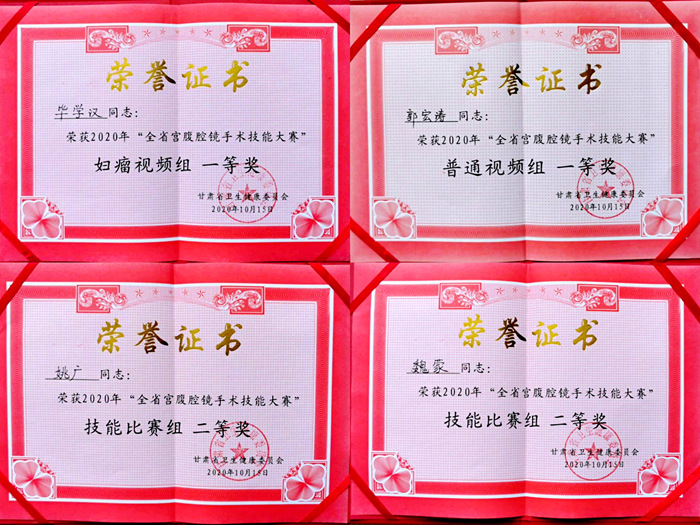 2020年10月14日—16日,甘肃省卫生健康委员会主办的2020年甘肃省宫腹腔镜手术技能大赛于在甘肃省妇幼保健院举行。兰大一院妇科代表队由刘畅主任带队,充分发扬团队精神,沉稳、睿智地应对每一环节,最终荣获甘肃省宫腹腔镜手术技能大赛团体一等奖。团队中,毕学汉副主任医师荣获妇瘤手术视频比赛组一等奖,郭宏涛医师荣获普通妇科手术视频比赛组一等奖,魏蒙及姚广医师分别荣获妇科腹腔镜技能比赛组二等奖。