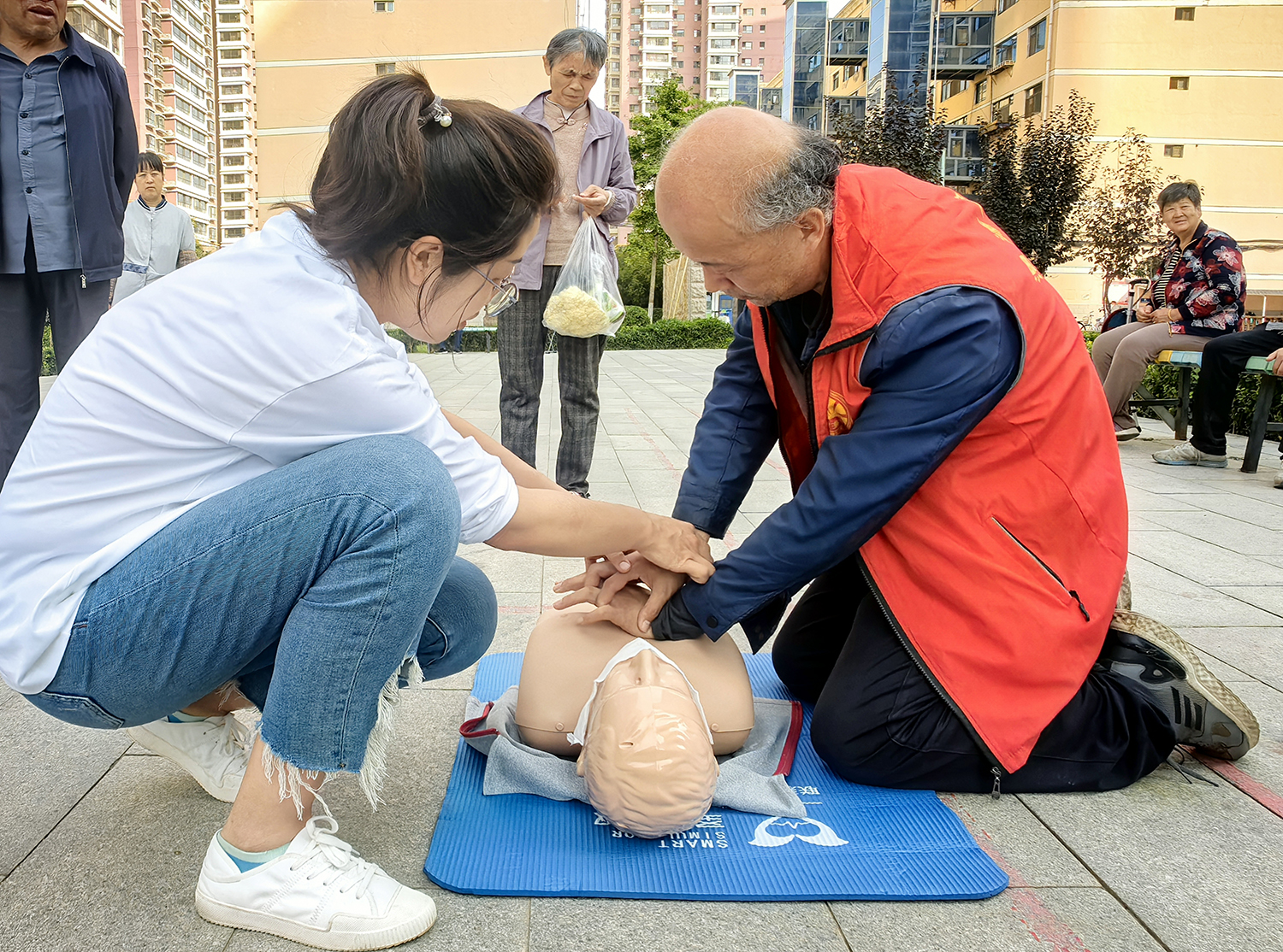 活动现场,兰大一院内科一片区护理团队为40余名民众进行急救知识讲解和现场技能培训,演示了单人徒手心肺复苏术和海姆立克法等急救方法,手把手指导民众利用模型人、模拟设备进行实操练习。