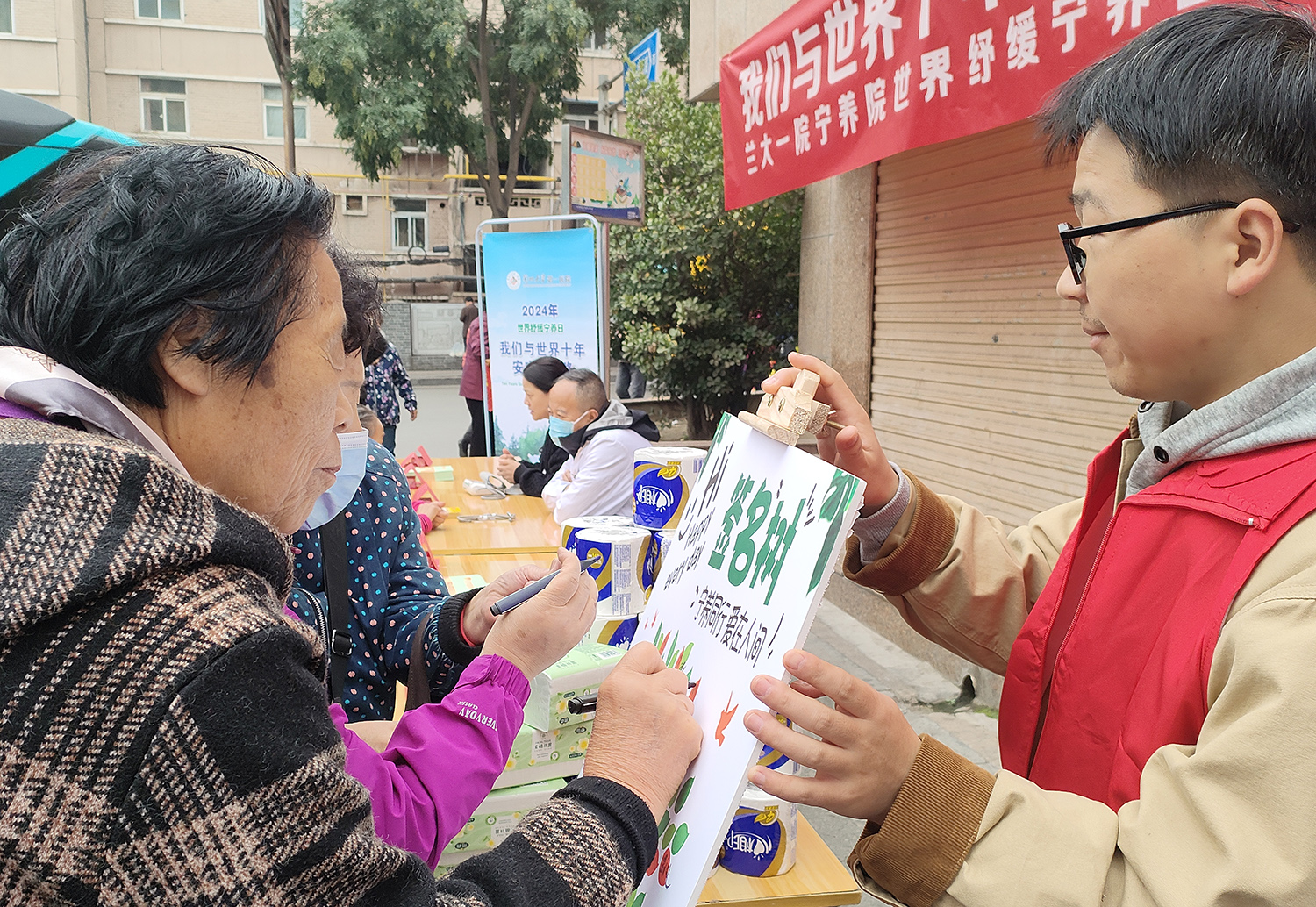 活动现场,医护人员为社区居民提供免费的健康咨询和检查服务,通过知识问答与游戏互动让大家在轻松愉快的氛围中了解更多关于宁养服务的知识。活动现场气氛热烈,许多居民还参与了签名倡议和手举牌拍照打卡环节。