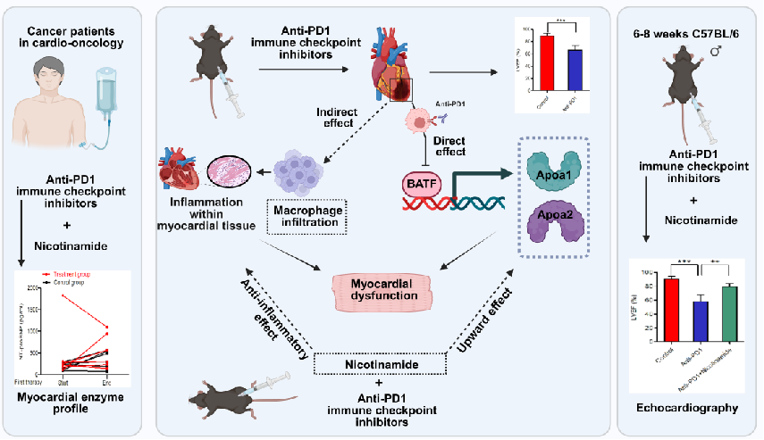 随着免疫检查点抑制剂在肿瘤治疗中的广泛应用,其所致心脏免疫相关不良事件(irAEs)已成为临床面临的严峻挑战。虽然心脏irAEs发生率较低,但起病隐匿、进展迅速、死亡率极高,且缺乏有效的预警和防治手段。该研究通过多中心临床数据与实验研究相结合,首次发现PD-1抑制剂通过下调转录因子BATF,直接导致心脏保护因子载脂蛋白ApoA1/ApoA2表达下降,且心肌组织中巨噬细胞浸润增多是导致心功能下降的重要环节,而烟酰胺能够显著上调ApoA1/ApoA2表达,抑制心肌炎症反应,保护心功能。