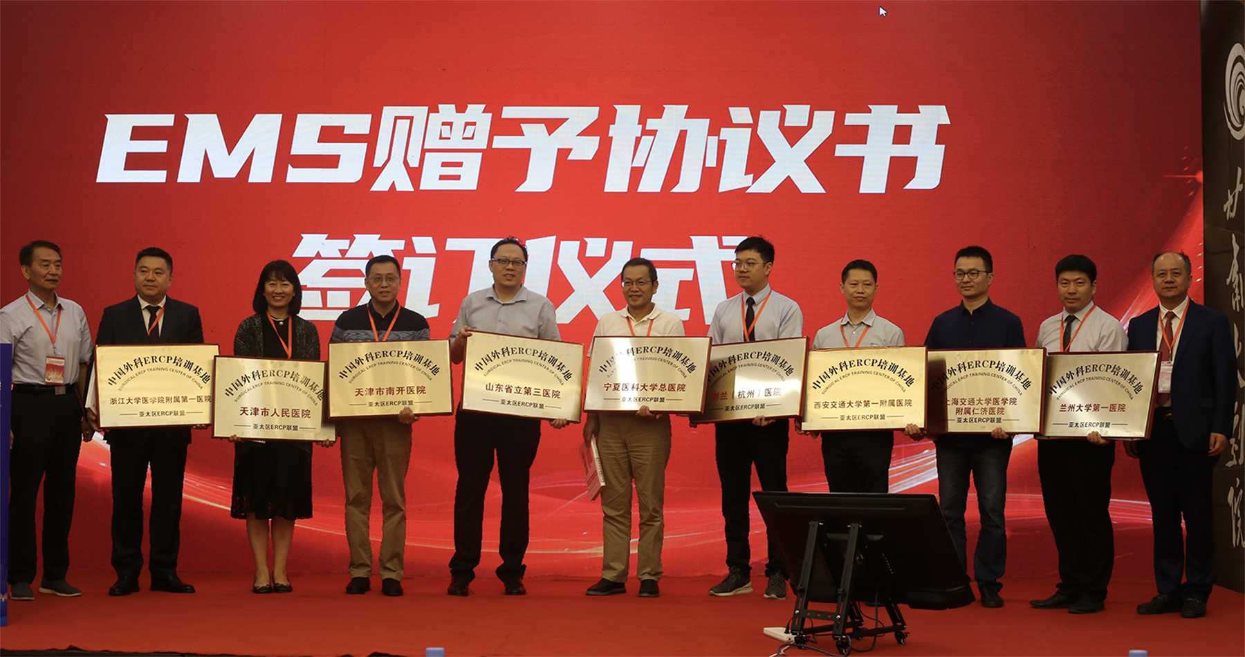 会上,麻树人教授和李汛教授共同为16家培训中心进行授牌,并赠送了由李汛教授主译、李兆申院士主审的《胃肠介入内镜新技术》一书及第四代ERCP模拟器。同时,李汛教授和培训中心代表杨富春教授(浙江大学医学院附属第一医院)共同签订了《EMS赠与协议书》。