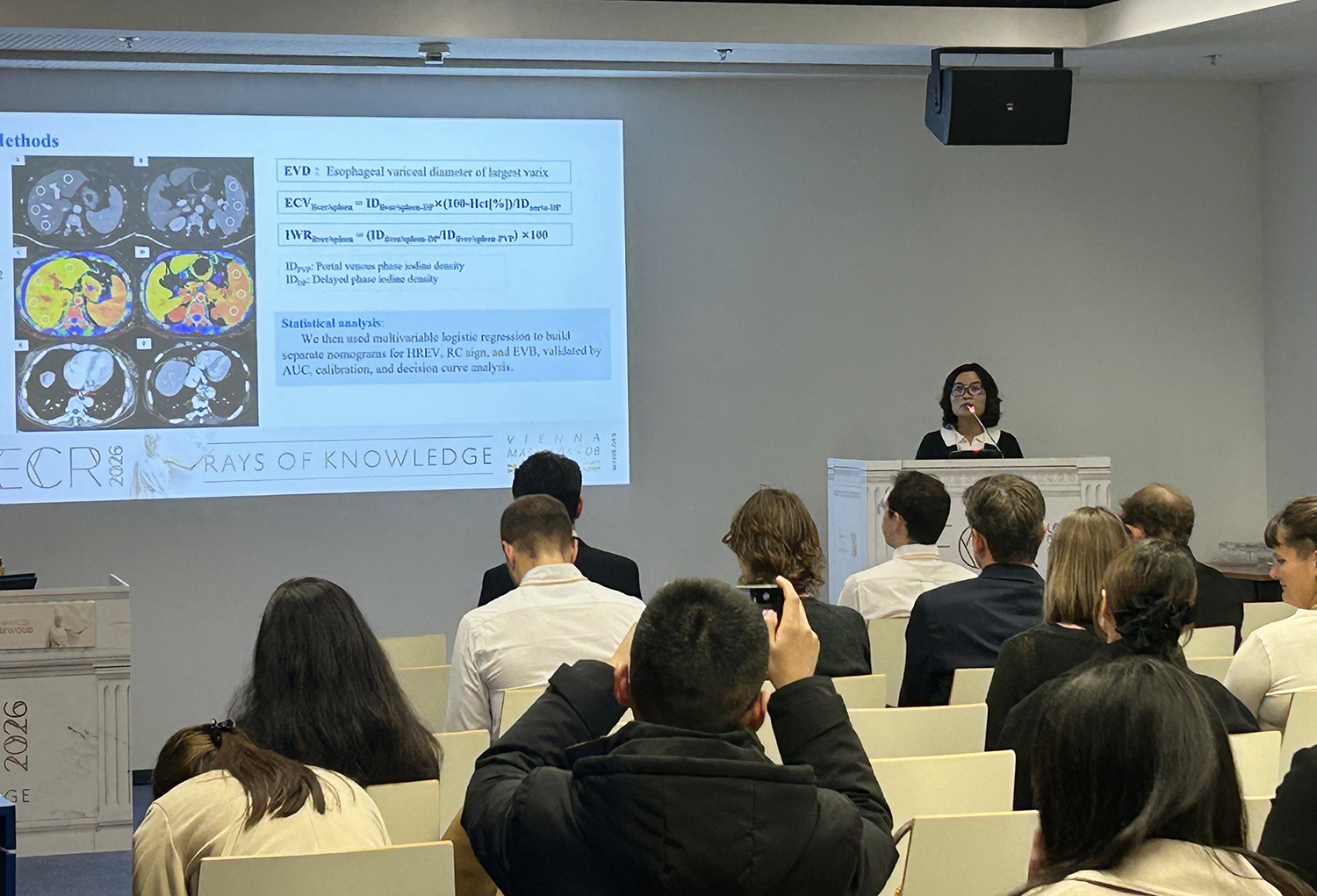 黎金葵副主任医师以A Dual-layer Spectral Nomogram Integrating Structural, Functional and Morphological Parameters for Risk Stratification of Esophageal Varices in Cirrhosis为题发言,展示了多参数CT在肝硬化食管静脉曲张风险分层中的创新研究。该研究构建了基于双层探测器光谱CT的多参数联合模型,整合结构、功能及形态学指标,提升了食管静脉曲张破裂出血的预测效能,为临床精准决策提供了有力支持。
