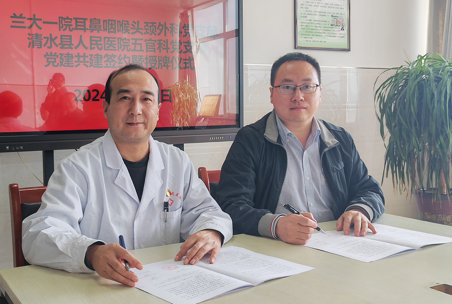 活动中,党支部书记桂岩与清水县人民医院五官科党支部书记高佩刚签订了党建结对共建协议,并带领全体党员同志重温了入党誓词。耳鼻咽喉头颈外科主任陈小婉与清水县人民医院耳鼻喉科主任王旭江签订专科联盟协议并授牌。