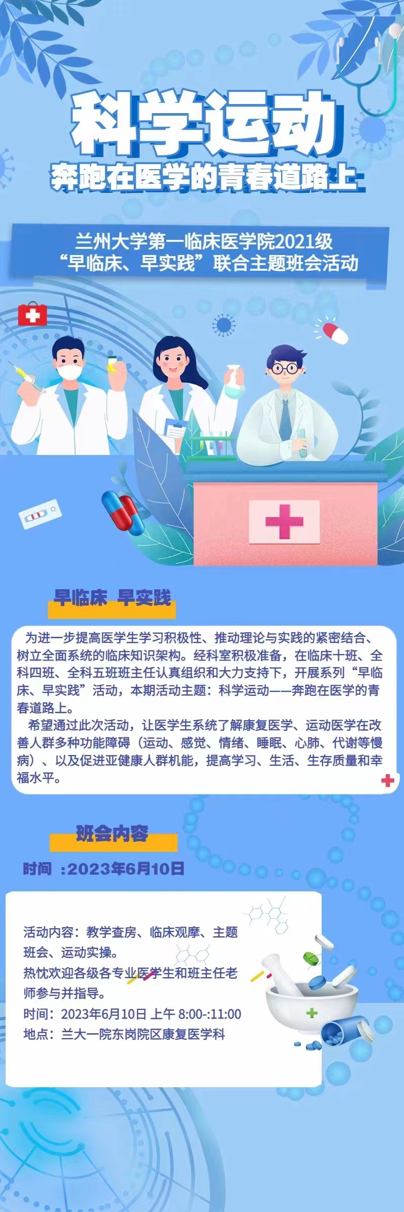 为进一步提高医学生学习积极性、推动理论与实践的紧密结合、树立全面系统的临床知识架构。经科室积极准备,在临床十班、全科四班、全科五班班主任认真组织和大力支持下,开展系列“早临床、早实践”活动,本期活动主题:科学运动一一奔跑在医学的青春道路上。