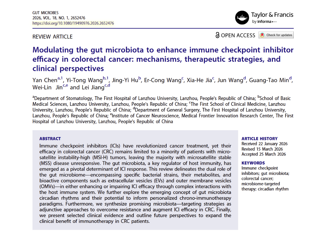 文章链接:Chen, Y., Wang, Y. T., Hu, J. Y., Wang, E. C., Jia, X. H., Wang, J., Min, G. T., Jin, W. L., Jiang, L. (2026). Modulating the gut microbiota to enhance immune checkpoint inhibitor efficacy in colorectal cancer: mechanisms, therapeutic strategies, and clinical perspectives. Gut Microbes, 18(1). https://doi.org/10.1080/19490976.2026.2652476