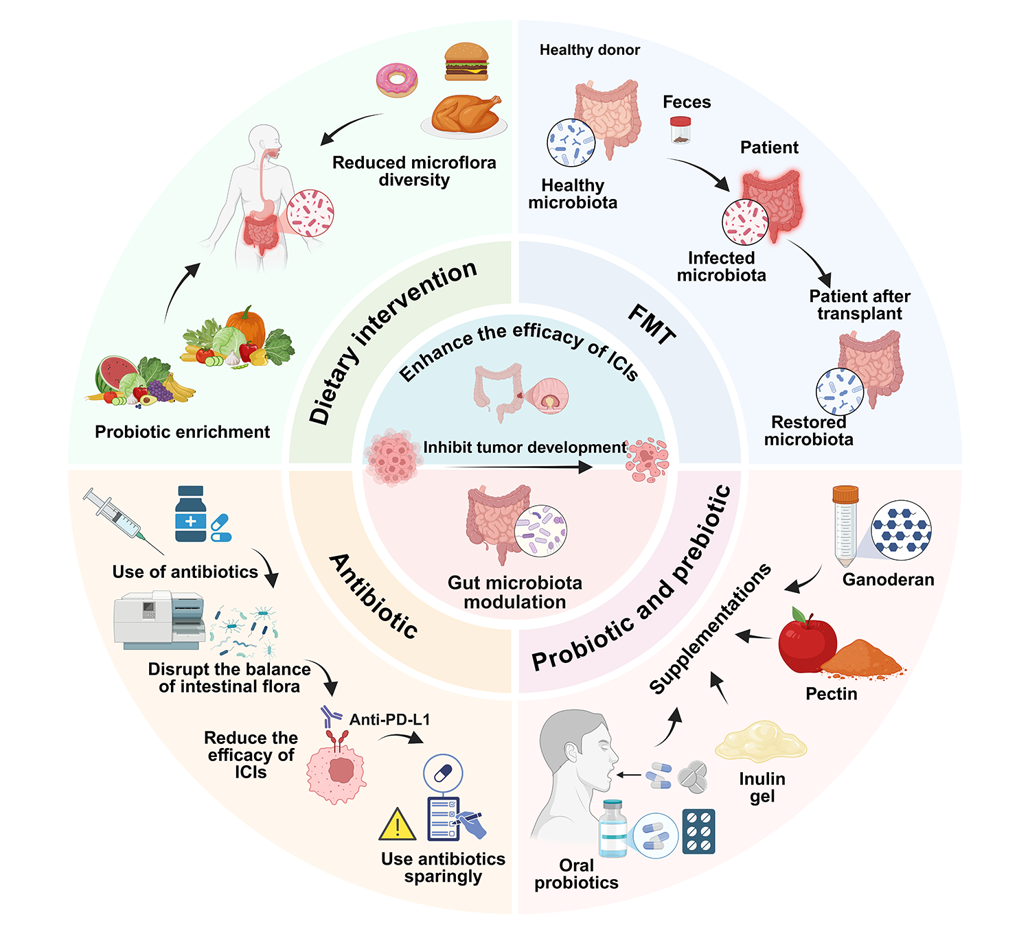 基于上述机制,综述系统总结出四大类可临床转化的微生物靶向治疗策略:饮食干预(高纤维饮食、限时进食)、粪菌移植(FMT)、益生菌与特定益生元(如VE800、MRx0518已进入I期临床试验)以及精准抗菌治疗(脂质体抗生素、噬菌体疗法、CRISPR介导的微生物组编辑)。