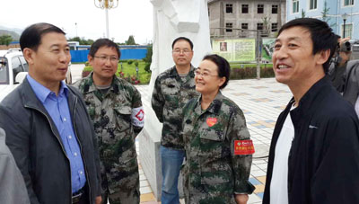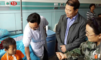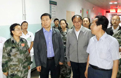 7月25日下午,甘肃省卫生厅副厅长李存文、定西市副市长陈国栋以及漳县副县长李国毅到定西灾区漳县县医院慰问我院驻漳县抗震救灾医疗队,指导伤员救治工作。