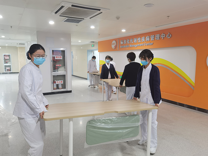 12月1日,诊室钥匙交接后,区域组长带领各组员,将所管楼层诊室内外打扫干净,所有物资配备到位,物品摆放整齐划一,为开诊做好充分的准备。同时,对新入职员工进行了统一入职培训,包括礼仪、患者就诊流程、各楼层功能设置、自助机、叫号系统以及采血系统的培训。并按照前期门诊部整体搬迁工作计划,将新入职员工分配各个区域组长进行“老带新”工作。当天晚上,新门诊综合楼五楼准备到位。