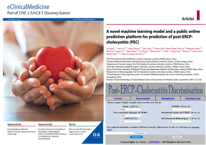 2022年6月,国际权威期刊柳叶刀The Lancet子刊EClinicalMedcine(IF=17.033,Q1)全文刊发了兰州大学首届“十佳导学团队”之一的第一临床医学院普外导学团队关于ERCP术后胆囊炎的机器学习模型及在线预测平台成果。