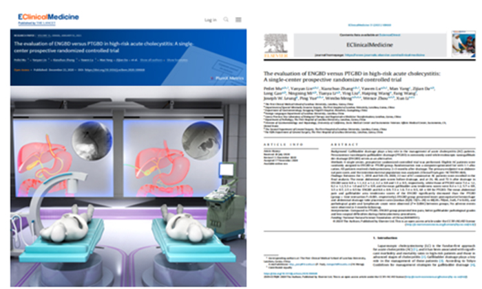 近年来,该导学团队在肝胆胰外科及内镜微创外科治疗方面开展了一系列基础及临床研究。2021年,该团队针对急性胆囊炎高危手术患者行胆道姑息引流方案选择难题开展了前瞻性临床对照随机试验,该研究由导学团队指导2017级专业型硕士研究生穆培磊完成。研究结果证明在治疗效果、并发症及患者满意度方面,经内镜胆囊引流术(ENGBD)均明显优于经皮穿刺胆囊引流(PTGBD),相关研究成果(The evaluation of ENGBD versus PTGBD in high-risk acute cholecystitis:A single-center prospective randomized controlled trial)于2021年在EClinicalMedcine发表(IF=17.033,Q1)。
