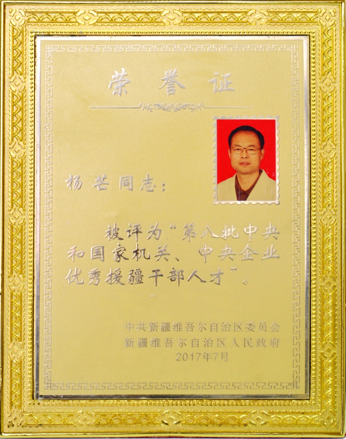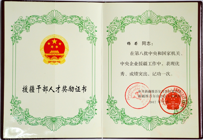 2017年7月15日上午,新疆维吾尔自治区党委、政府召开大会,表彰第八批中央和国家机关、中央企业援疆工作先进集体和优秀个人。我院口腔科主任医师杨芒同志被新疆维吾尔自治区党委、自治区人民政府授予“第八批中央和国家机关、中央企业优秀援疆干部人才荣誉称号”,并记功一次。据悉,该荣誉是援疆工作的个人最高荣誉,也是我院迄今唯一获此殊荣的援疆干部人才。