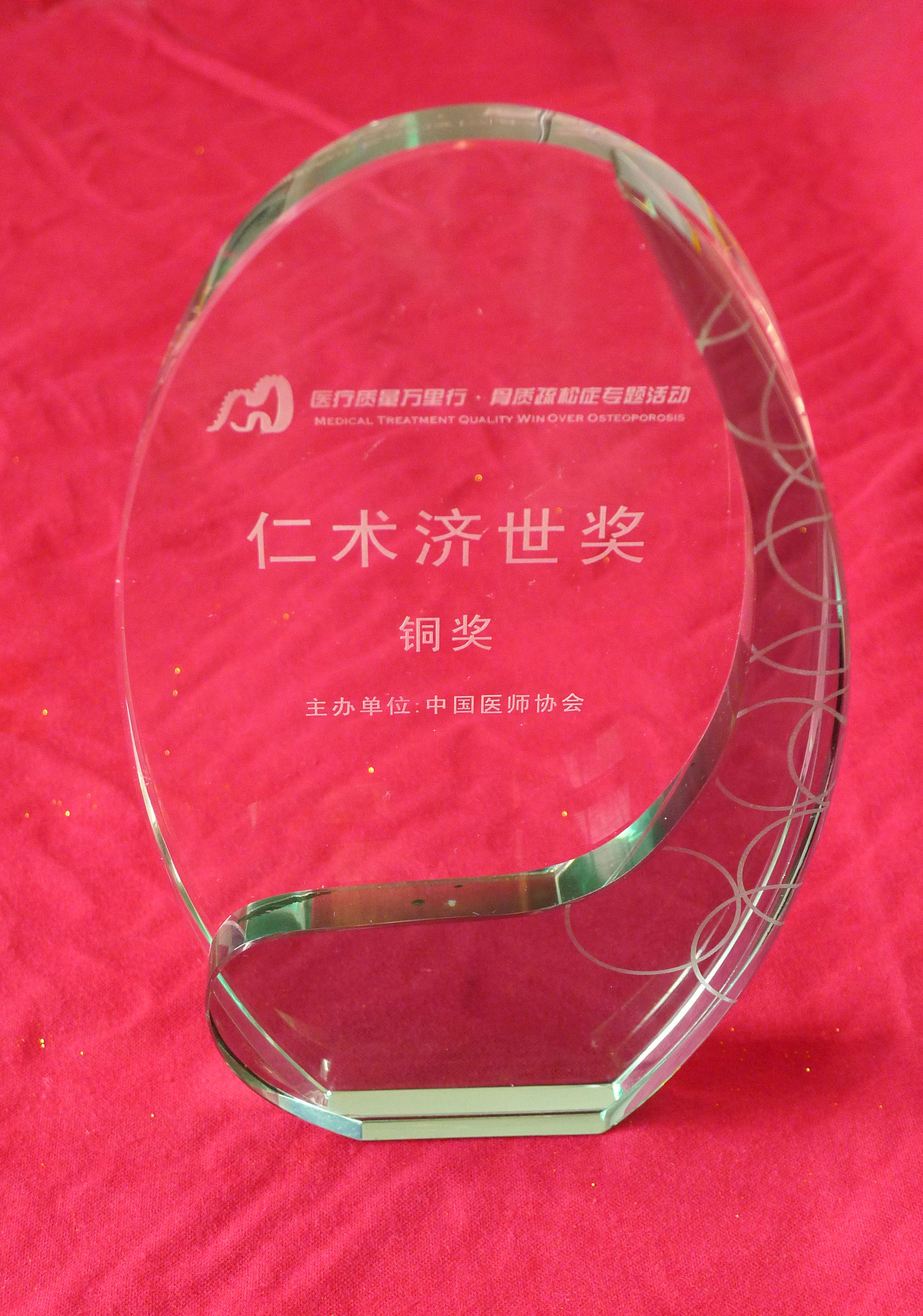 2010年10月28日,由卫生部医政司与中国医师协会共同主办的“医疗质量万里行——骨质疏松专题”项目一周年总结报告会上,我院骨质疏松专科荣获“仁术济世奖”铜奖。