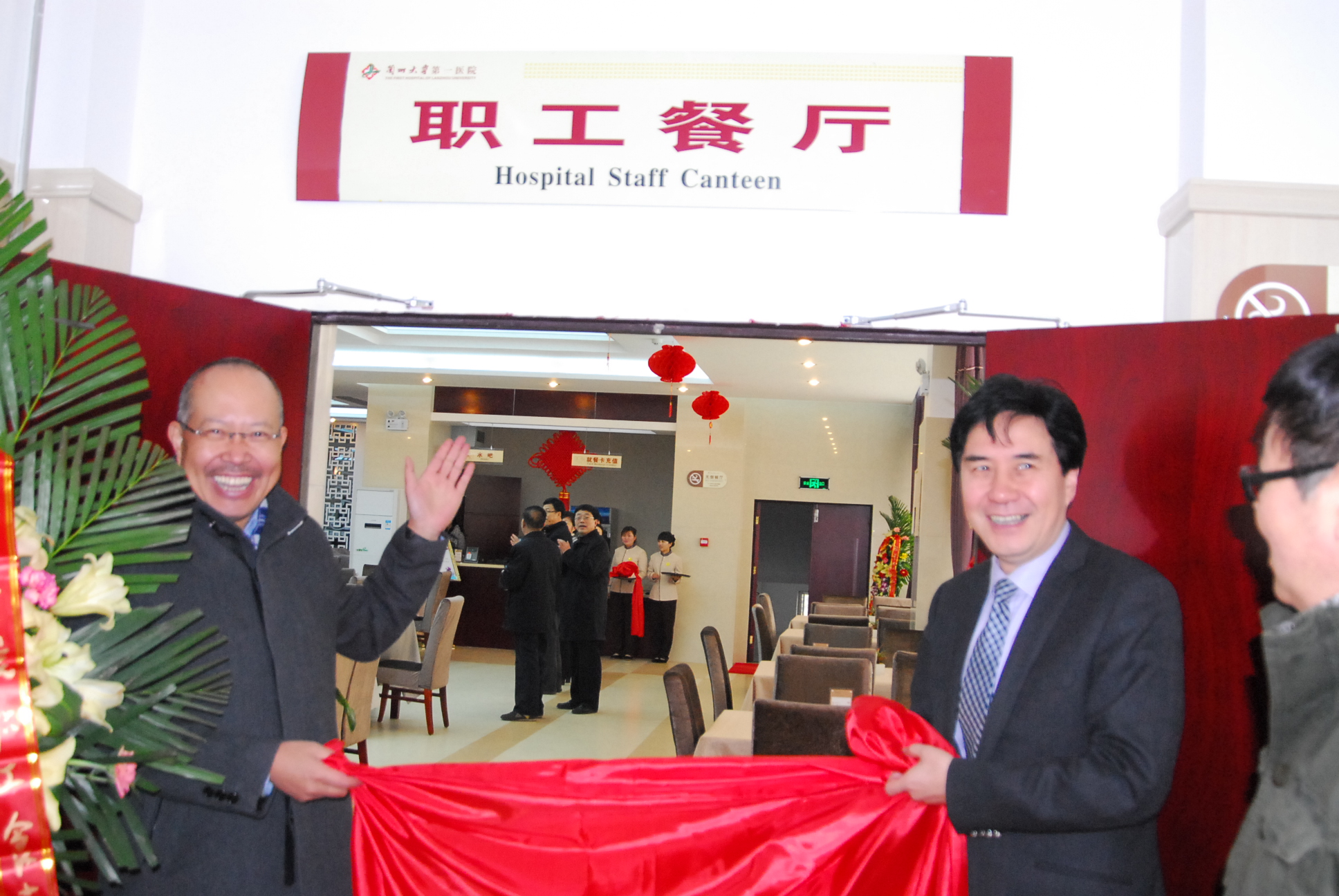 仪式上,院长严祥和党委书记郭琦共同为职工食堂剪彩,并对为筹建餐厅付出努力的部门和单位表示感谢,希望大家集思广益,把餐厅建设好,把职工生活搞好。副院长余勤和郭顺林一起为职工食堂揭牌,职工食堂的正式开业,使职工得到了真正的实惠和方便,让大家感受到了集体的温暖和关爱。