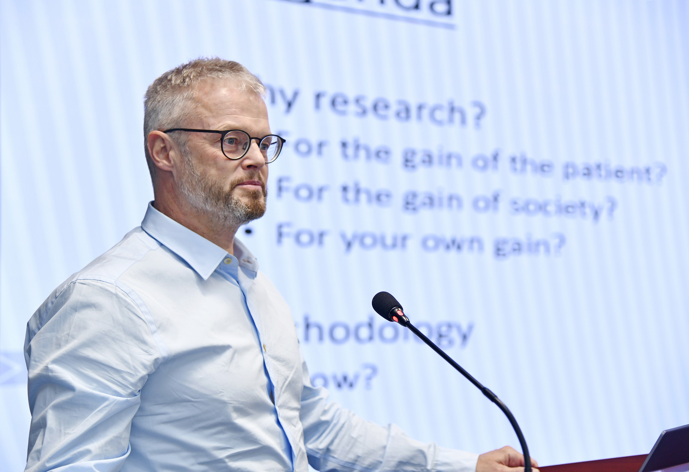 Eske Aasvang教授分享了《做科研和开展合作时多问“为什么”的重要性》,强调了科研工作应始于好奇心,在临床诊疗工作的同时,发现问题、收集灵感,同时勇于打破常规、敢于挑战权威,坚持具有创新性的科研。Bjarne Hjaltain副教授以《从学生到训练有素的科研人员,伴随着医护人员一生的任务——来自丹麦的经验》为题,分享了丹麦青年医生在临床工作、科研发展及跨学科合作方面的经验,并鼓励大家要知行结合,带着批判性思维从事科研工作。