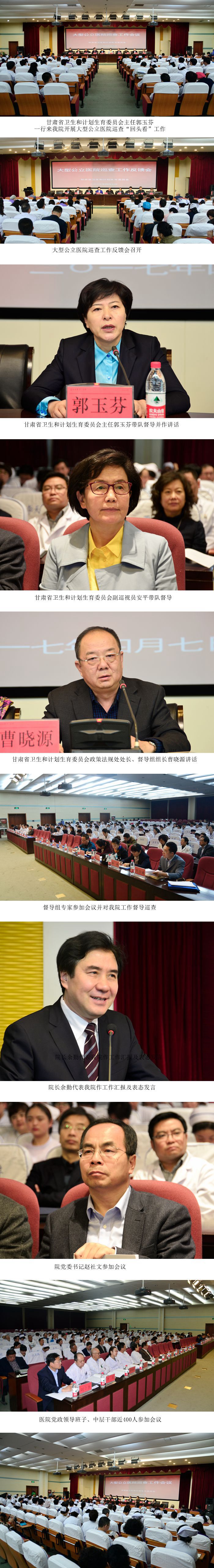 2017年4月6日、7日,根据国家卫生计生委大型医院巡查工作安排及省卫生计生委党委部署,由甘肃省卫生和计划生育委员会主任郭玉芬、副巡视员安平带队,政策法规处处长曹晓源任组长及有关专家一行13人组成的督察组来我院开展大型公立医院巡查“回头看”工作。