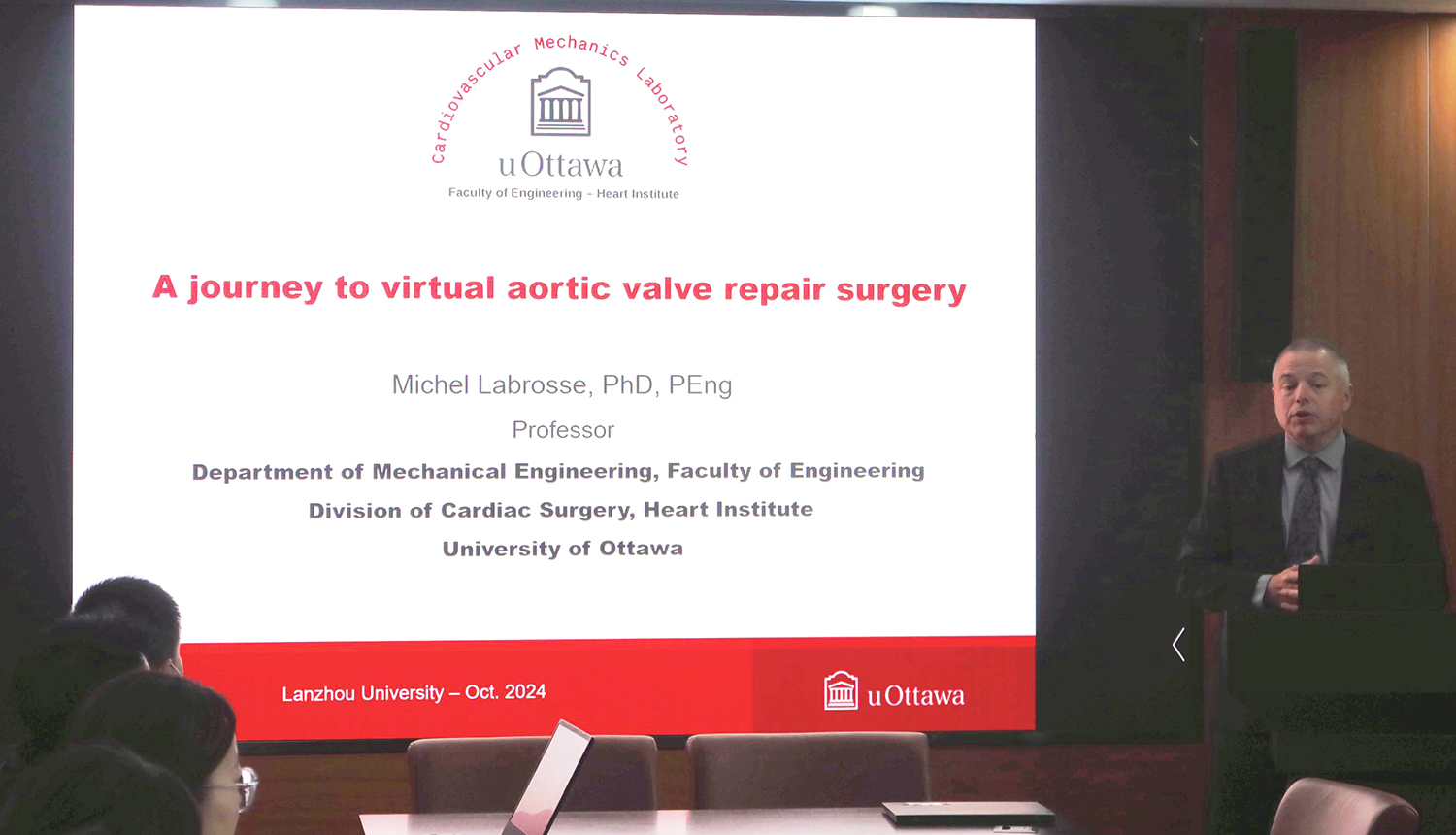 座谈会上,Michel Labrosse教授就“心血管工程学领域的最新进展”进行了学术讲座,分享了他在渥太华卡尔顿生物医学工程研究所(Carleton Institute of Biomedical Engineering, Ottawa)心血管力学实验室(Cardiovascular Mechanics Laboratory)的研究成果。兰大一院心内科骨干医师江尕学、潘晨亮、王小娟、赵晶等分别围绕“兰大一院心脏瓣膜病诊治现状及目前临床研究”“机械循环支持的流体力学问题探讨”“心脏中心心超情况介绍及相关科研探讨”进行了学术分享。参会人员与Michel Labrosse教授就心血管工程学领域的热点问题进行交流探讨,双方一致表示,希望能够进一步加强合作交流,共同推动医、教、研方面的深度合作。