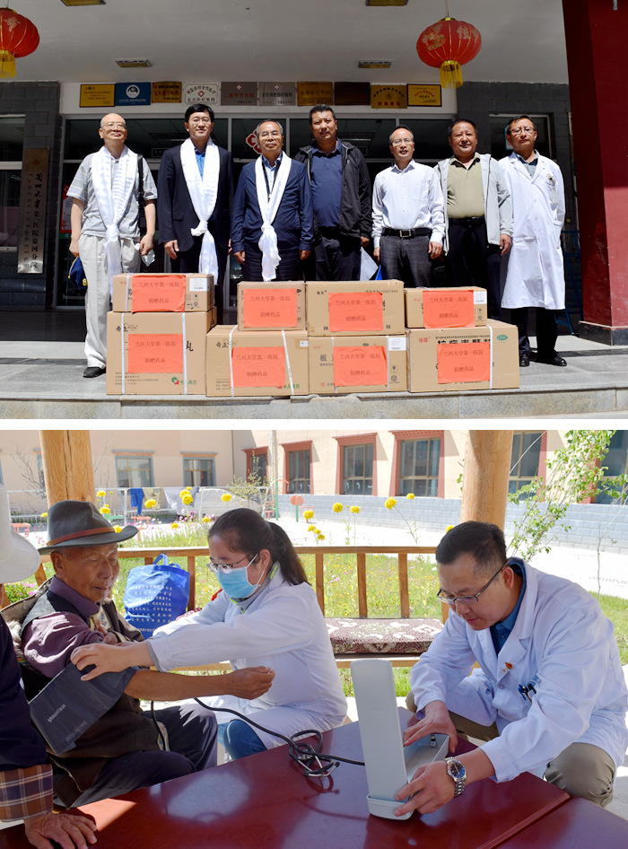 刚到达夏河,药剂科党支部、夏河县人民医院党支部的部分党员与兰大一院“组团式”帮扶医疗队队员即组成医疗小组,分赴王格尔塘镇中心敬老院、拉卜楞镇敬老院为40名孤寡老人测量血压、血糖,进行眼部检查等健康体检及对症诊疗活动。针对高原常见病的特点、支部持续几年为敬老院老人体检的记录及本次体检结果,药剂科党支部给老人们带来了基本治疗药品,嘱咐老人按要求服药并反复交待敬老院的工作人员认真做好药品管理与发放工作。党委书记赵社文代表兰大一院为两所敬老院的老人赠送了米面油和生活日用品,祝愿他们晚年生活幸福,身体健康长寿。