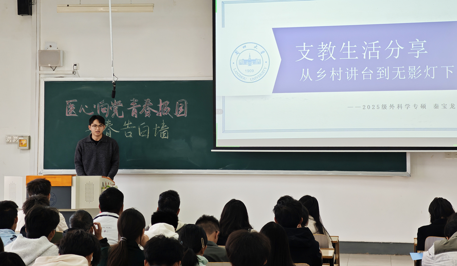 秦宝龙同学分享了基层支教期间的实践感悟与开展健康科普服务的经历。他通过具体事例展现了基层医疗现状,鼓励同学们既要坚定理想、仰望星空,也要脚踏实地、深耕实践,要主动走进基层、体察国情,将个人成长与国家医疗事业紧密相连,用青春热血扛起“白衣脊梁”的使命,诠释医学生的初心与担当。