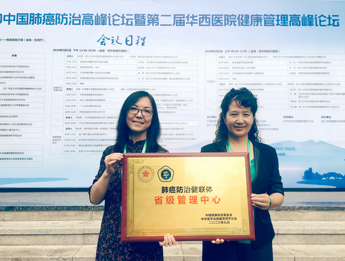 9月5日,在“2020中国肺癌防治高峰论坛暨第二届华西医院健康管理高峰论坛”大会上,兰大一院健康体检中心代表医院捧回“肺癌防治健联体省级管理中心”的授牌,这是兰大一院在健康管理学科发展道路上获得的又一殊荣。