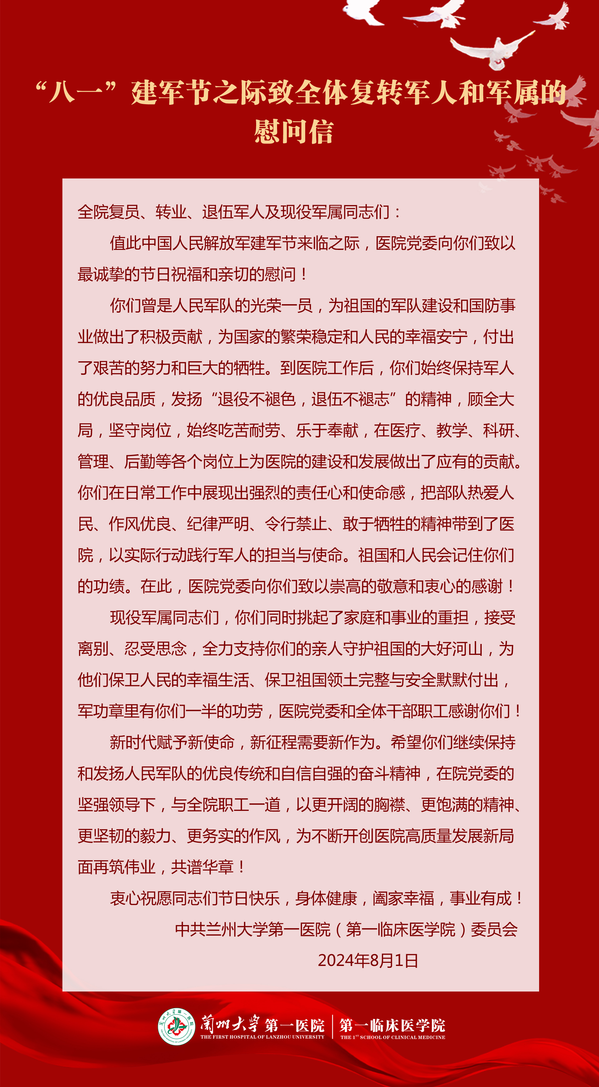 “八一”建军节之际致全体复转军人和军属的慰问信
