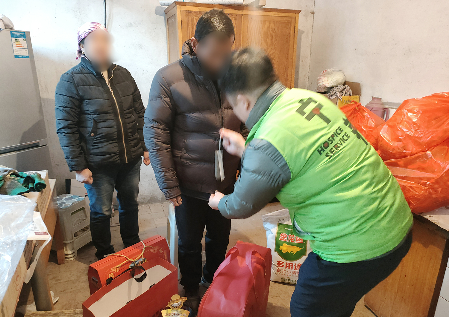 宁养院主任令晓玲、护士长魏才娟分别带队。全体工作人员、义工先后前往城关区、七里河区、西固区、榆中县、永登县,走村入户,将生活必需品与慰问金送到患者及家属手中,详细了解患者身体状况与生活需求,鼓励他们坚定信心、积极面对、共度难关。困难家庭对宁养院的长期关怀表示感激:“感谢全国宁养办和兰州大学第一医院宁养院全体医护人员一直牵挂着我们,不仅提供免费的宁养服务,还送来生活必需品和慰问金,让我们这个年过得更踏实、更温暖。”