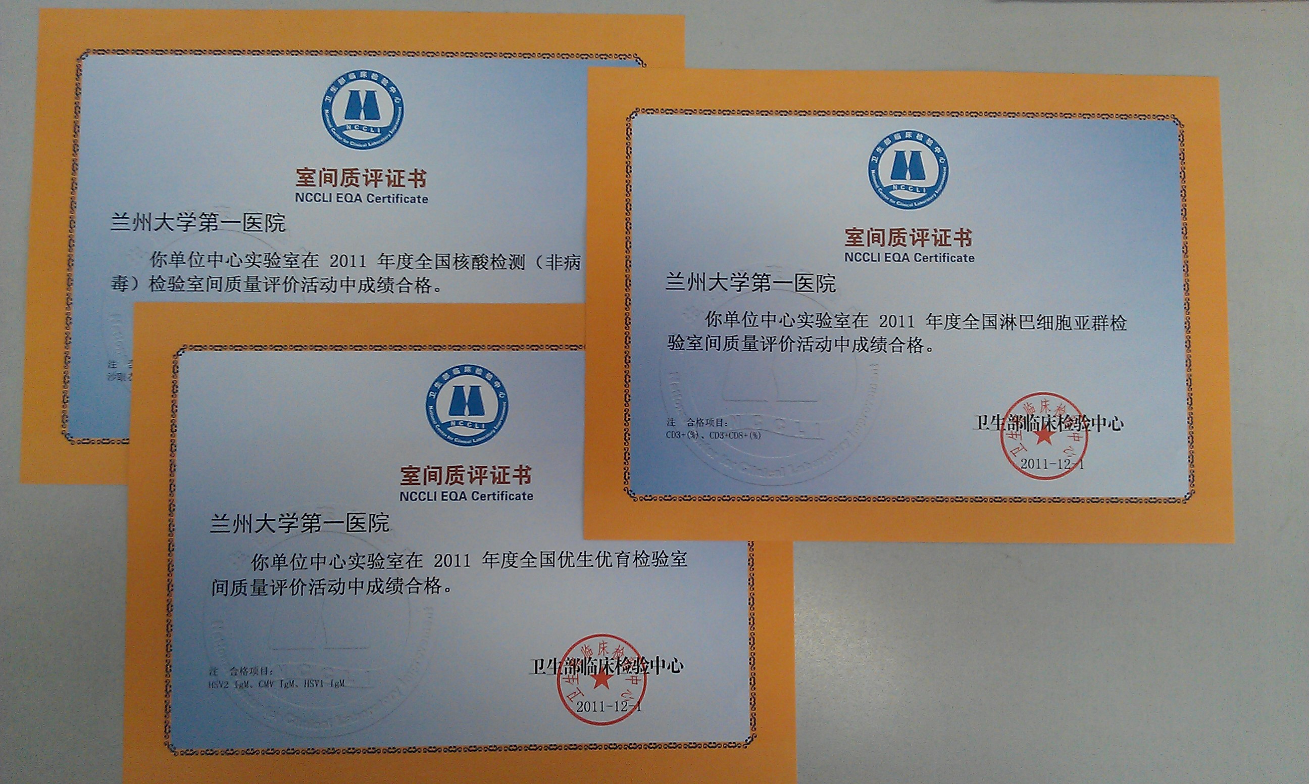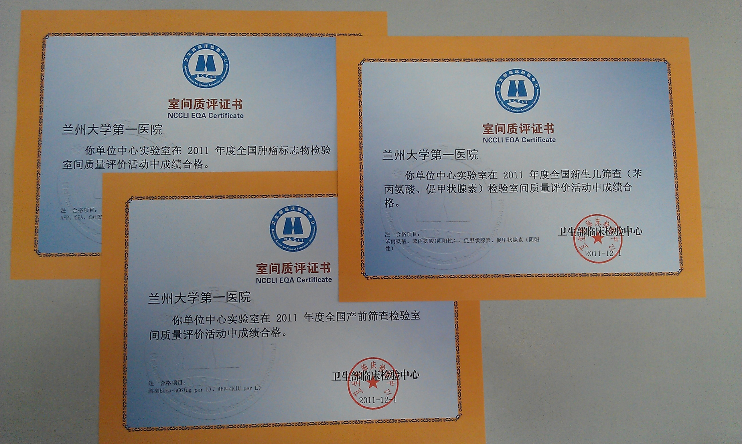 近日,我院中心实验室顺利通过卫生部临床检验中心2011年度的全国新生儿筛查、产前筛查、肿瘤标记物全项、非病毒核酸检测、优生优育和淋巴细胞亚群的六大类共计22项的室间质评活动,成绩全部合格。其中全国新生儿筛查检验室间质量评价活动从2000年开始参加,历年成绩全部合格。