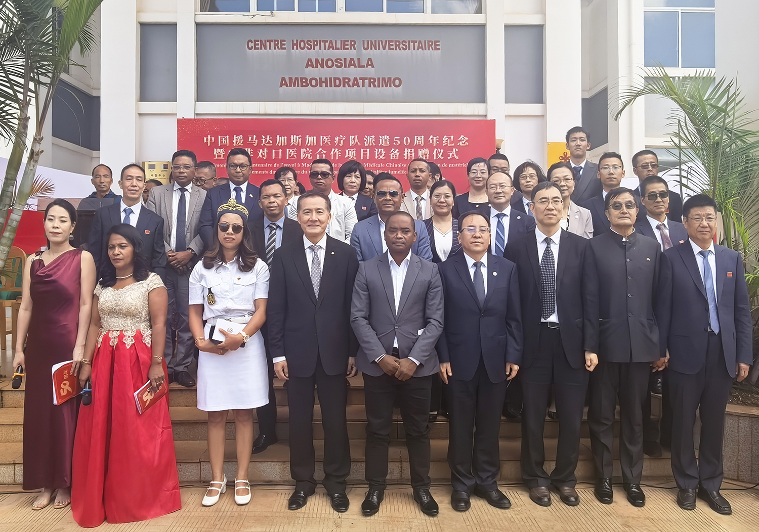 24日上午,中国援马医疗队派遣50周年纪念暨中非对口医院合作项目设备捐赠仪式在马达加斯加阿努西亚拉医院隆重举行。中国驻马达加斯加大使馆季平大使、大使馆霍维参赞、马达加斯加公共卫生部秘书长兰德里亚南比尼纳、兰州大学第一医院党委书记王定峰,第二十四批援马医疗队队员及当地民众300多人参加活动。