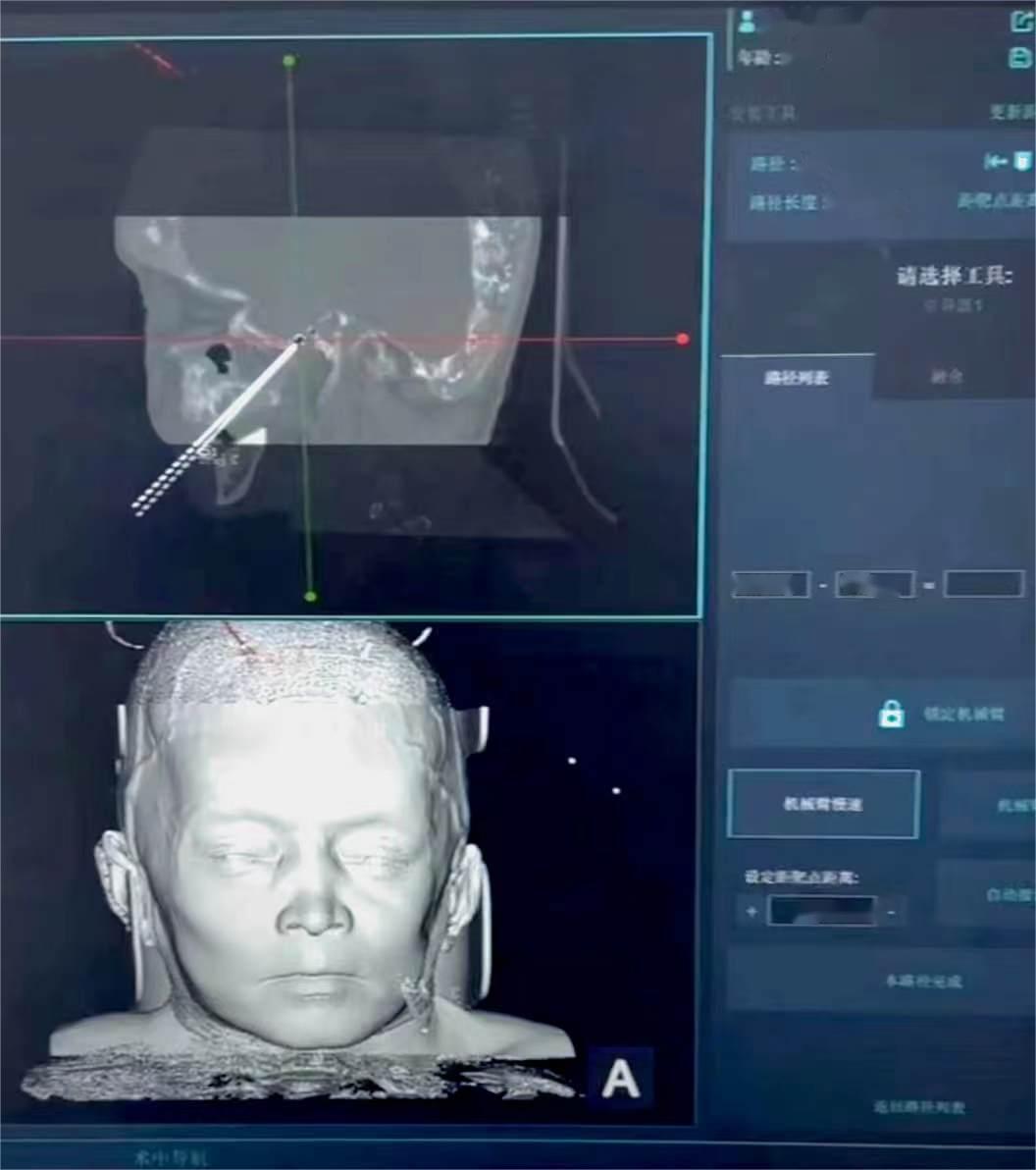 三叉神经痛(Trigeminal Neuralgia,TN)是一种临床常见的神经病理性疼痛。典型的三叉神经痛被描述为颜面部三叉神经支配区域暴发性剧烈针刺样、电击样或刀割样疼痛,持续数秒至一分钟,严重影响患者生活质量。目前临床常应用经皮穿刺三叉神经半月结球囊压迫术(PMC)治疗该疾病,该手术通过穿刺颅骨自然孔道(卵圆孔),球囊压迫三叉神经半月结进行治疗。但由于该患者同时患颅骨纤维异常增殖症,头颅CT显示患者颅骨增厚,颅骨畸形,骨质显著异常增生,颅骨整体解剖结构混乱,PMC手术常规穿刺路径被增殖的异常颅骨阻碍,故穿刺路径难以确定,穿刺风险极大。