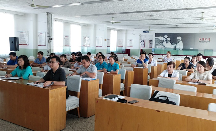 2018年8月23日下午,我院机关第二党总支在门诊七楼第二学术厅召开总支全体党员大会,组织开展行政机关如何做好“文明礼貌用语,提升服务质量”的主题党日活动,联系总支的院党委委员、总会计师安延宏同志为全体党员讲专题党课,机关第二党总支全体党员同志参加学习,会议由总支书记车世平主持。