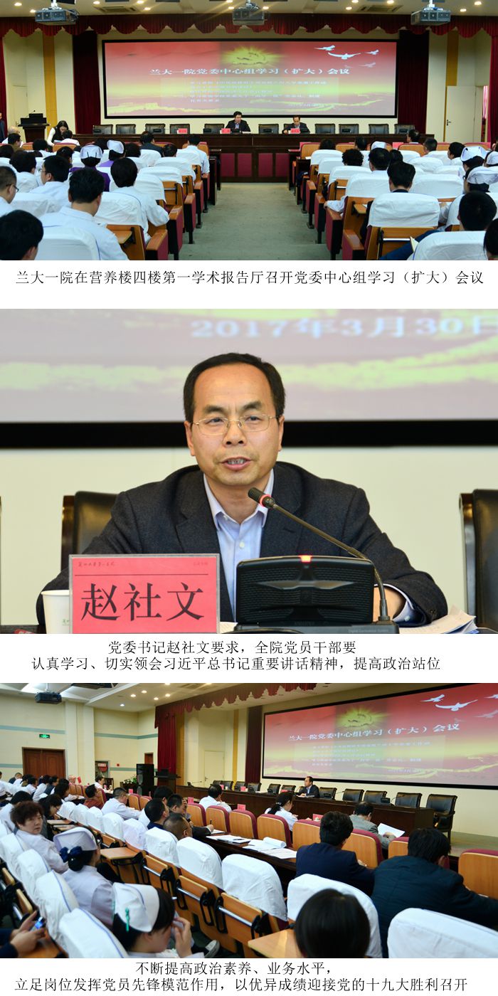 2017年3月30日下午4时,兰大一院在营养楼四楼第一学术报告厅召开党委中心组学习(扩大)会议。医院党政班子成员,各部门主要负责人,全院中层干部,各党总支、支部书记参加会议。会议由党委书记赵社文主持。