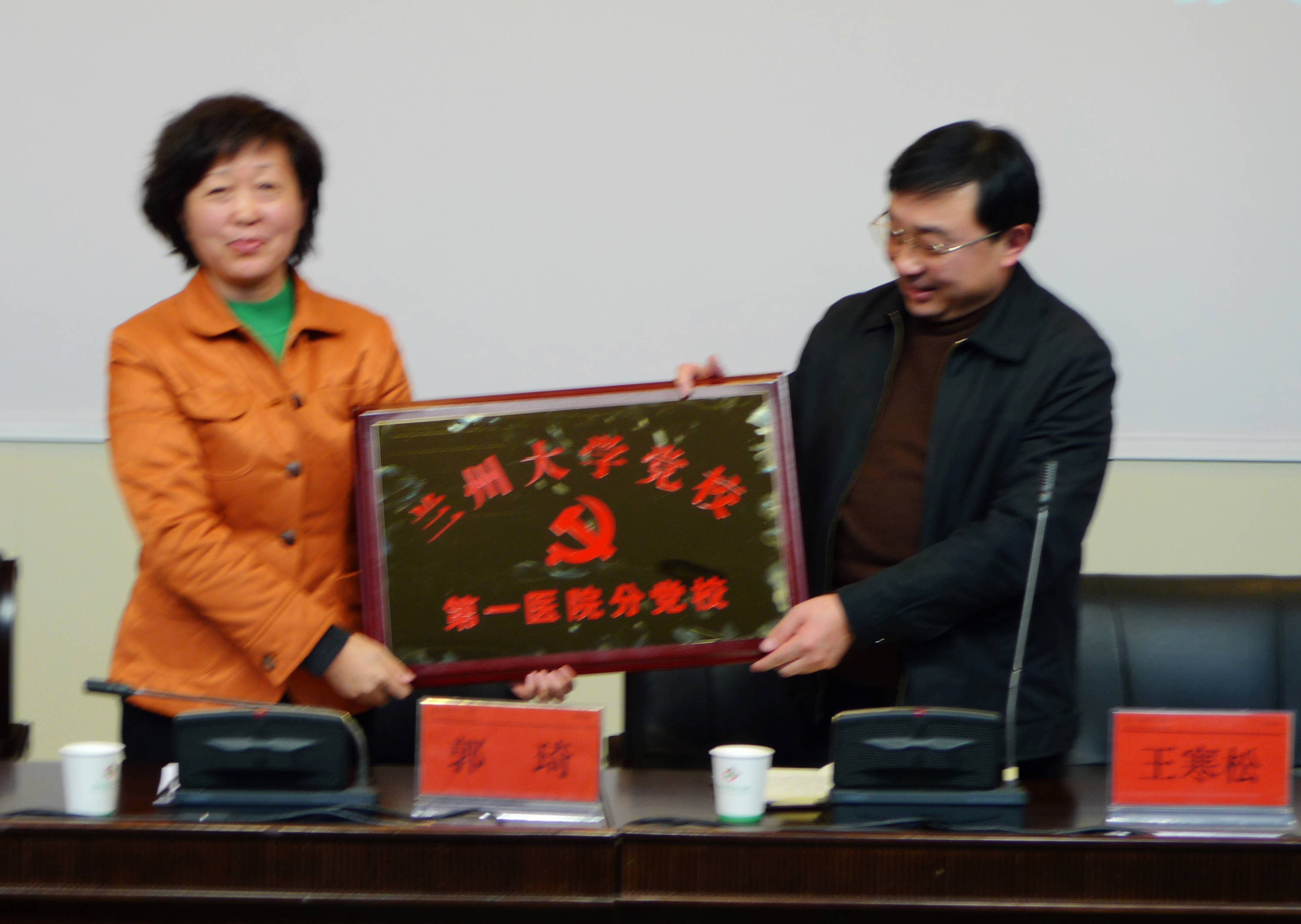 大会一开始,与会同志全体起立,奏响雄壮的《国际歌》,兰州大学党校常务副校长赵泽斌宣读了学校党委关于成立第一医院分党校的批复文件,校党委书记王寒松为分党校授牌。