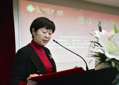 郭琦书记配合幻灯展示,为与会领导和职工介绍我院第四届科技文化节背景及活动内容。她指出,我院科技文化节的举办,旨在倡导医学人文精神,创造求实创新的学术氛围,提高医院文化品位和职工文化素养,突出我院紧密跟随党的路线方针政策开展工作的实践特色。自2006年起,我院定期举办科技文化艺术节,围绕特定主题,开展形式多样、内容丰富的科技文化活动,全院职工师生广泛参加。经不断发展完善,现已成为我院科技与文化建设工作开展与成果展示的重要载体,以及我院医院文化的重要组成。在连续成功举办三届科技文化节的基础上,依照惯例,我院于今年举办第四届科技文化节。