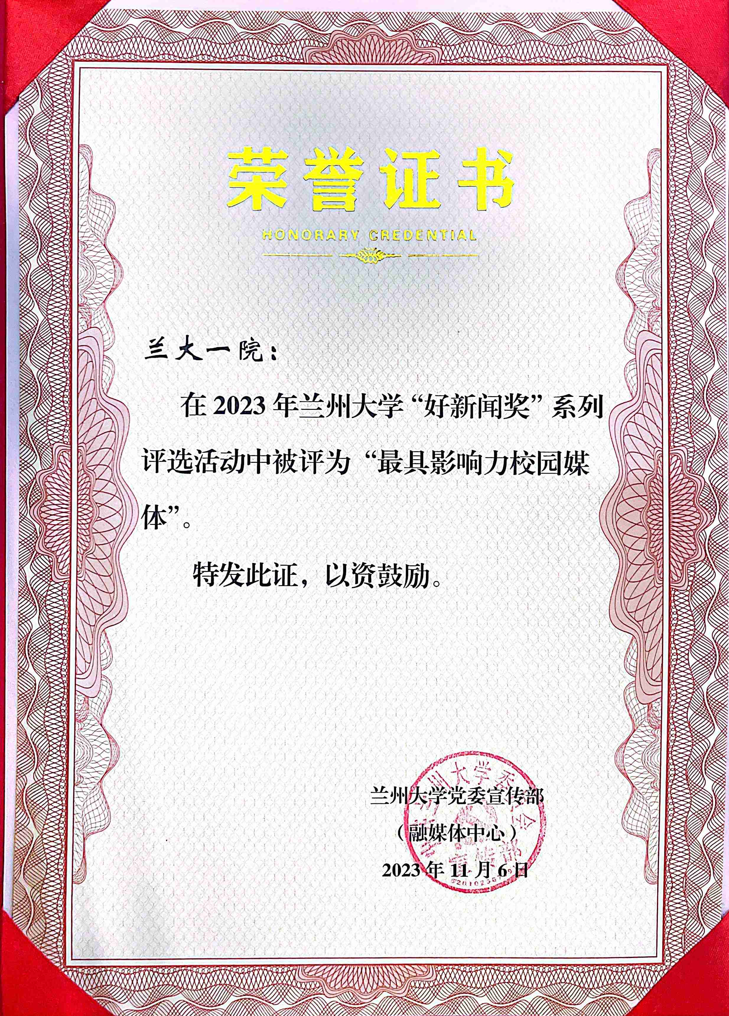 近日,在2023年兰州大学“好新闻奖”系列评选活动中,兰州大学第一医院官方微信公众号被评为“最具影响力校园媒体”。兰州大学第一医院官微现总用户已超过121万人,共发布1333条原创内容。