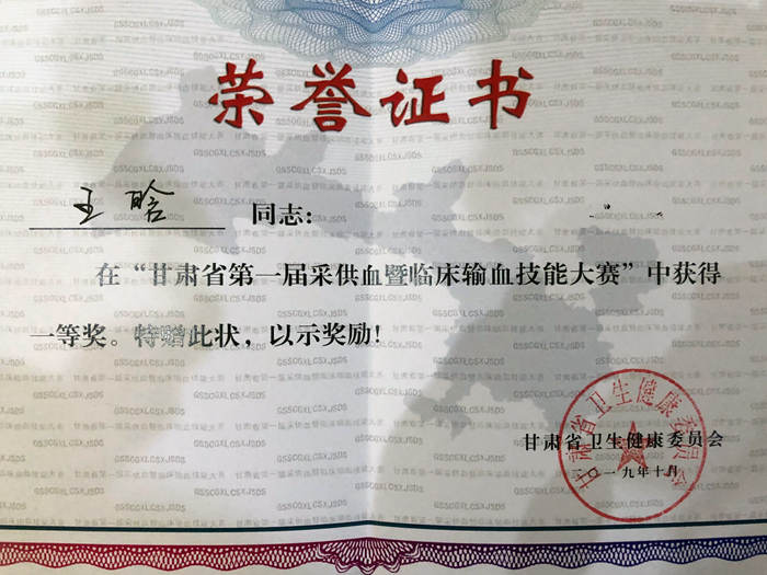 本次大赛由甘肃省卫健委主办,甘肃省血液中心承办。比赛共有全省15家采供血单位及24家医院输血科近百名专业技术人员参加了比赛,大赛分为采供血专业和临床输血专业两大类,每个类别均设置理论考核和专业技能考核环节。兰州大学第一医院输血管理科参赛队员王晗通过扎实的理论基础、熟练的技能操作竞赛环节,最终荣获个人一等奖的好成绩。此次竞赛院领导和科室的每一位同事都对参赛队员给予了很大帮助和指导,参赛队员不负众望,取得了优异成绩,为兰州大学第一医院输血科赢得了荣誉。