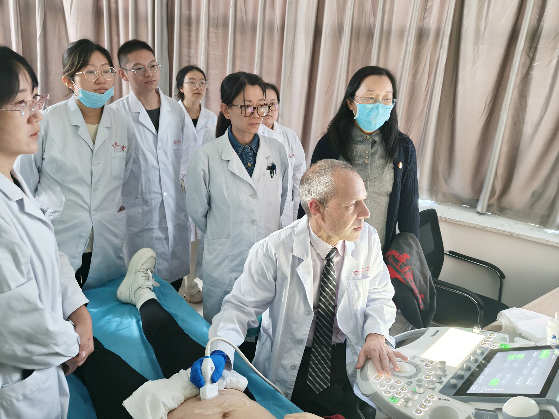 兰大一院超声医学科主任陈飞主持交流会,超声妇产学组全体成员参加。双方重点围绕产科学组的临床研究、产科病人规范化检查、后续医师互访等等合作方向进行了深入探讨,并对科室拟推荐赴加拿大交流学习的2名医师进行了面试。