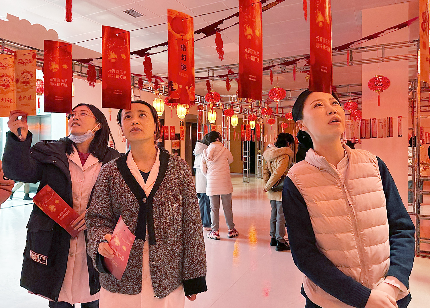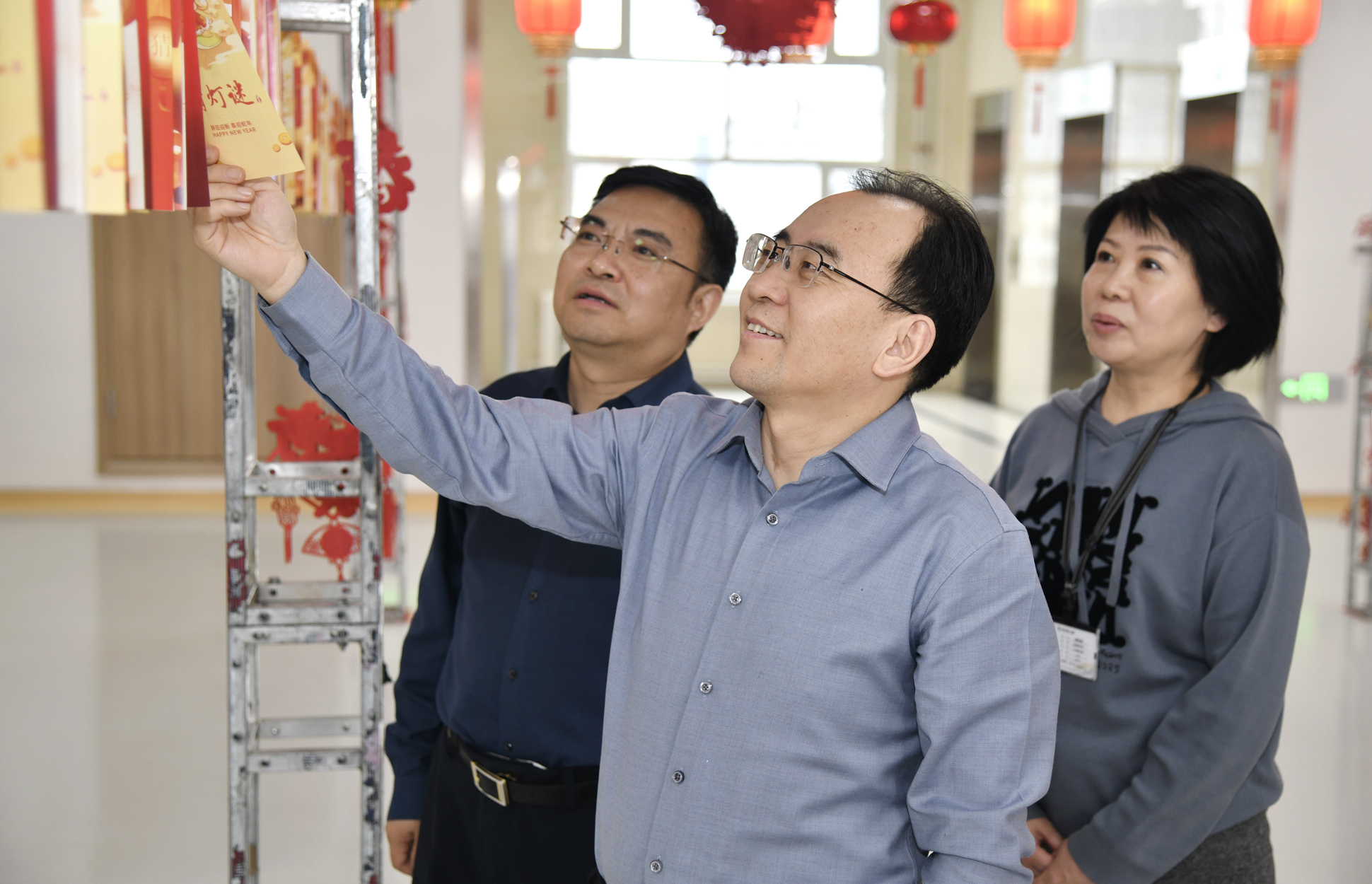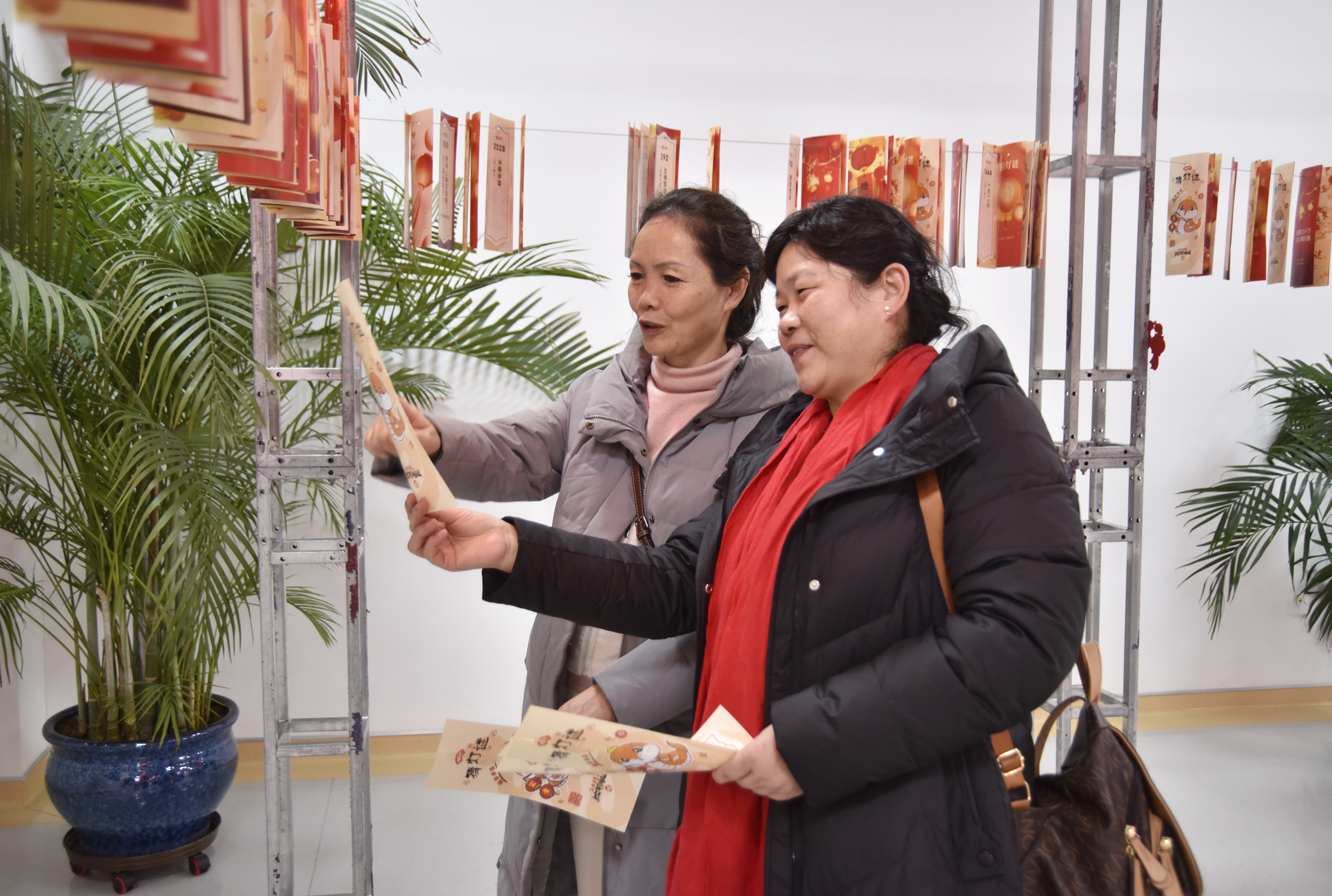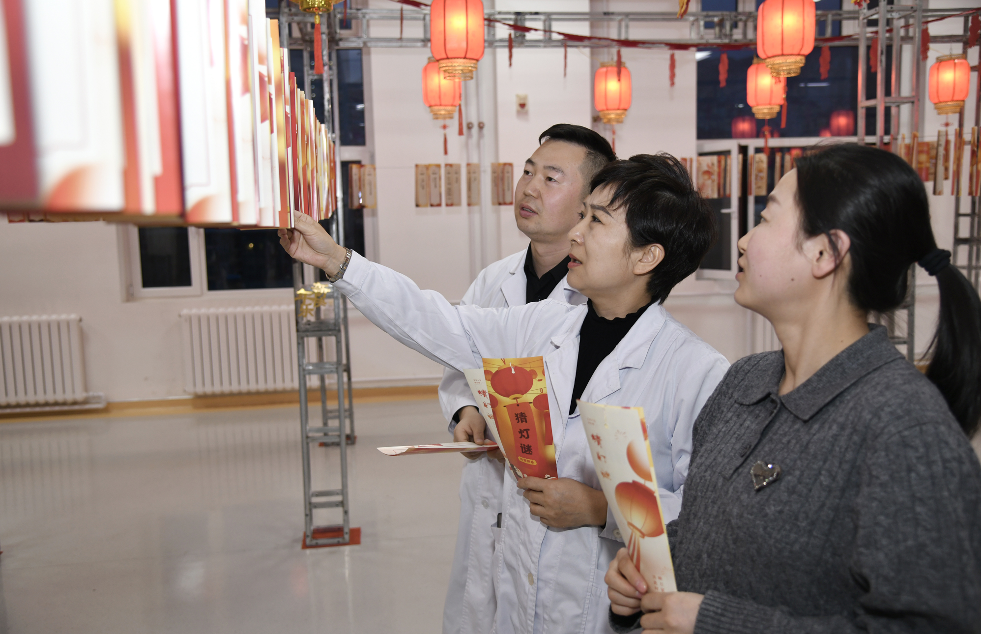 活动现场张灯结彩,喜气洋洋,一个个红彤彤的灯笼高高挂起,灯笼下悬挂数百条谜面形成长廊,内容既有传统字谜、成语谜,也有与医疗健康、医院文化相关的趣味谜语,吸引了众多职工驻足思考,踊跃参与,有的独自沉思,有的热烈讨论,在一片欢声笑语中一同体验猜谜的乐趣。