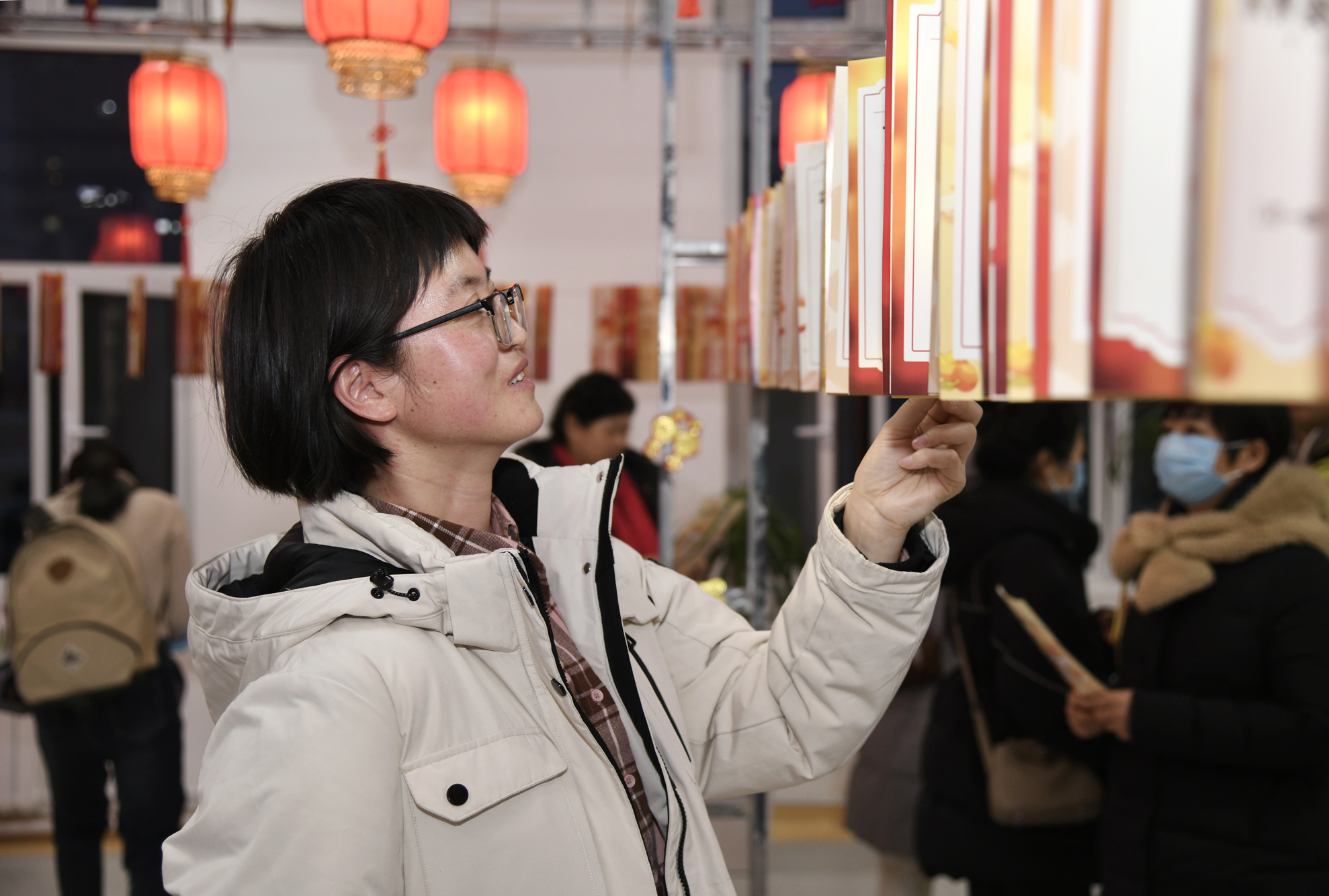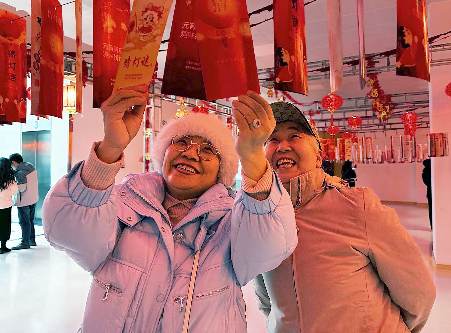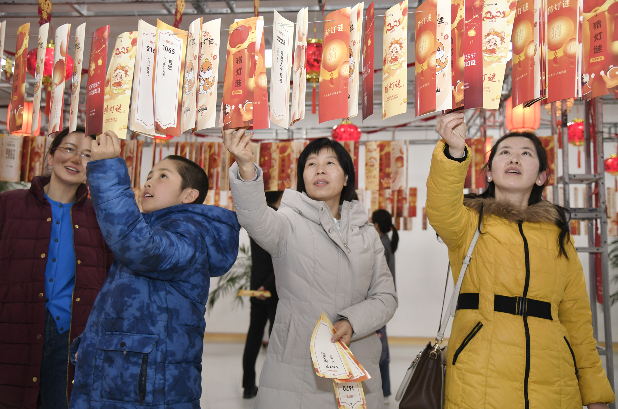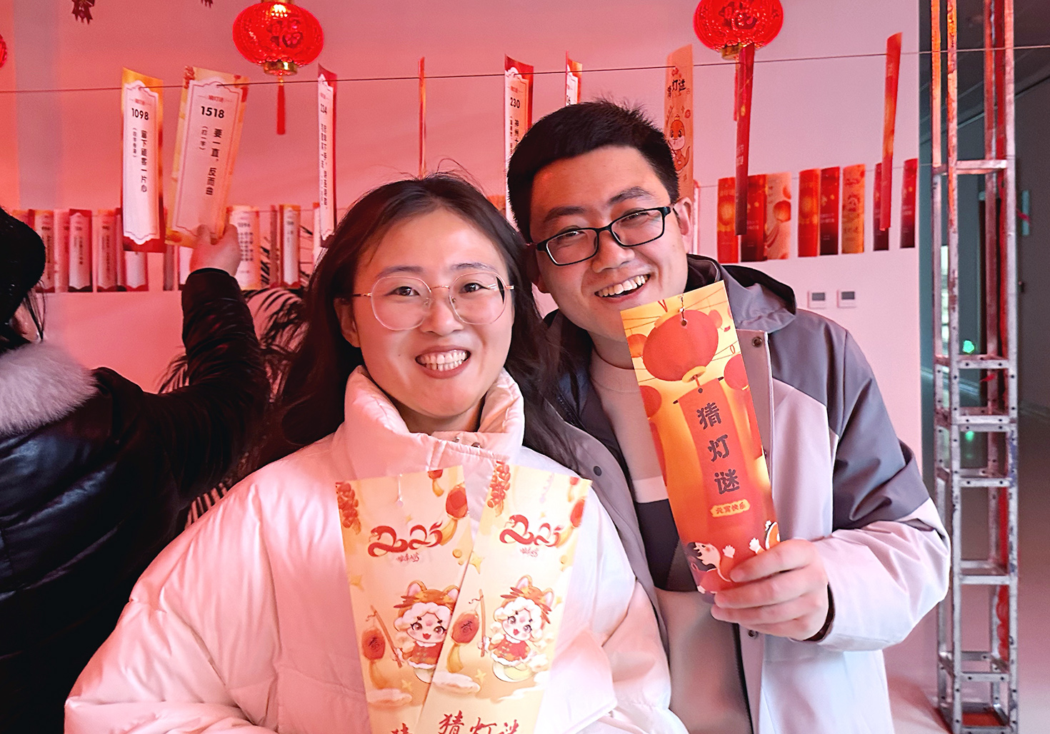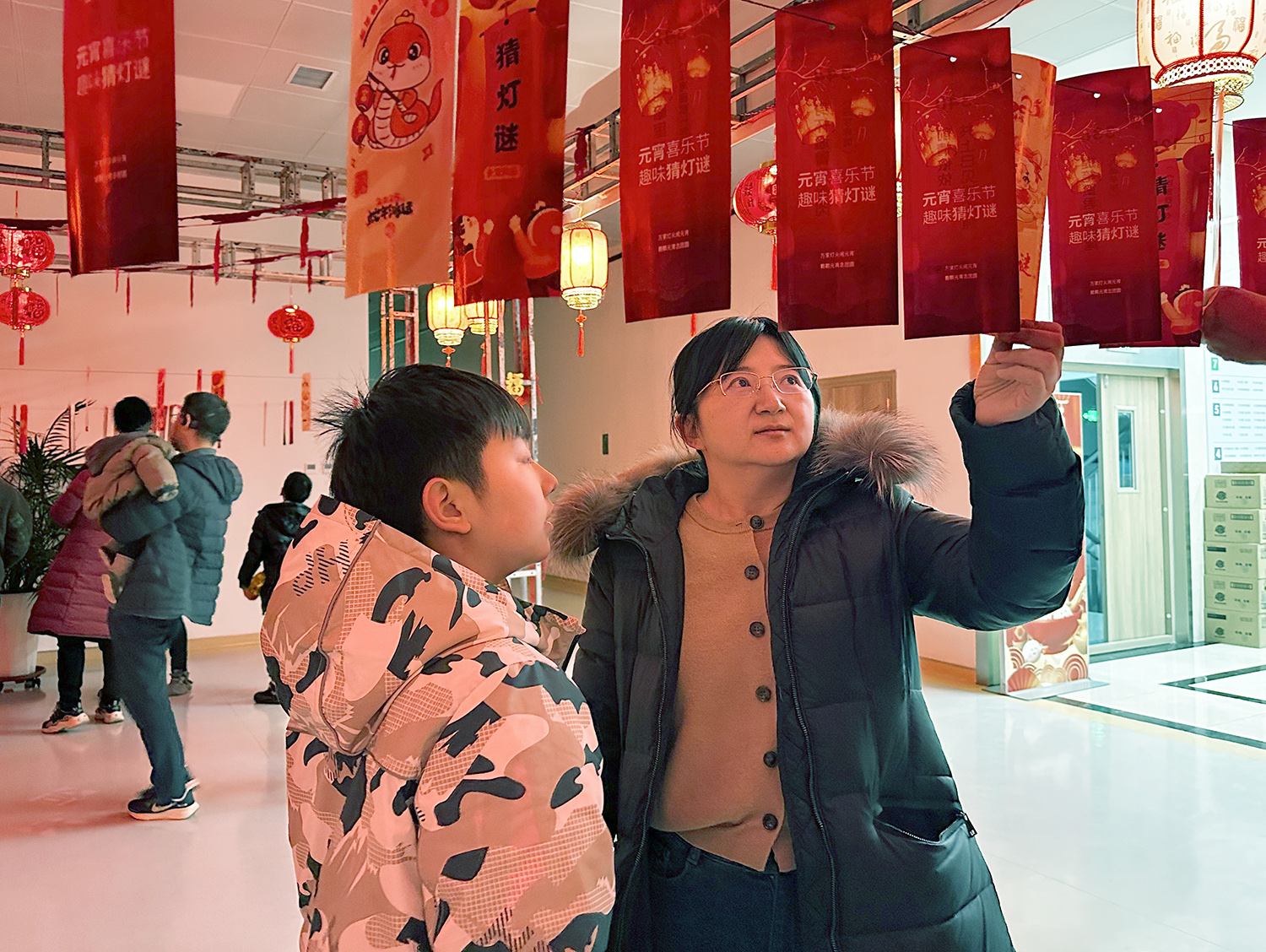 活动现场张灯结彩,喜气洋洋,一个个红彤彤的灯笼高高挂起,灯笼下悬挂数百条谜面形成长廊,内容既有传统字谜、成语谜,也有与医疗健康、医院文化相关的趣味谜语,吸引了众多职工驻足思考,踊跃参与,有的独自沉思,有的热烈讨论,在一片欢声笑语中一同体验猜谜的乐趣。