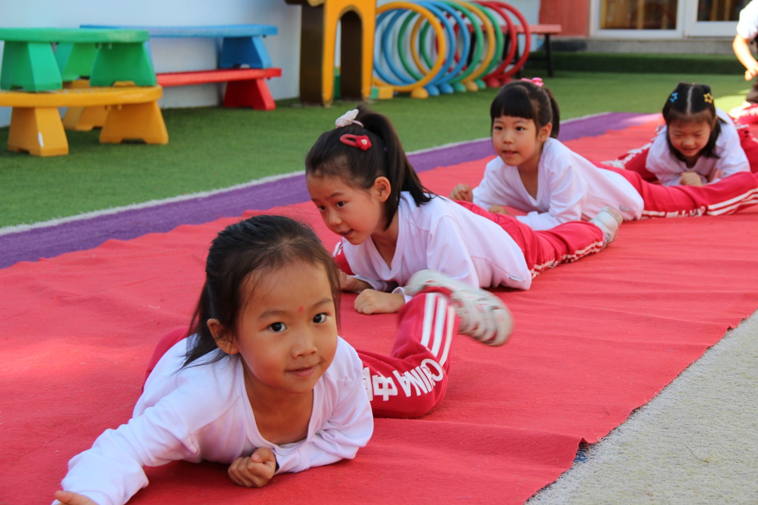 “红星闪闪放光彩,红星灿灿暖胸怀……”。在重走“长征路”活动中,老师为孩子们简单讲解了国家历史和红军故事。怀着对英雄的无限敬仰,孩子们在老师的精心策划下,化身为勇敢无畏的“小红军”,踏上了模拟长征的征途。利用桌椅、红毯布局,活动现场转化为翻越皑皑雪山、穿越茫茫草地、突破重重封锁线的场景。孩子们面对困难勇往直前,不怕苦、不怕累,争相展现新时代“小红军”的豪情壮志。