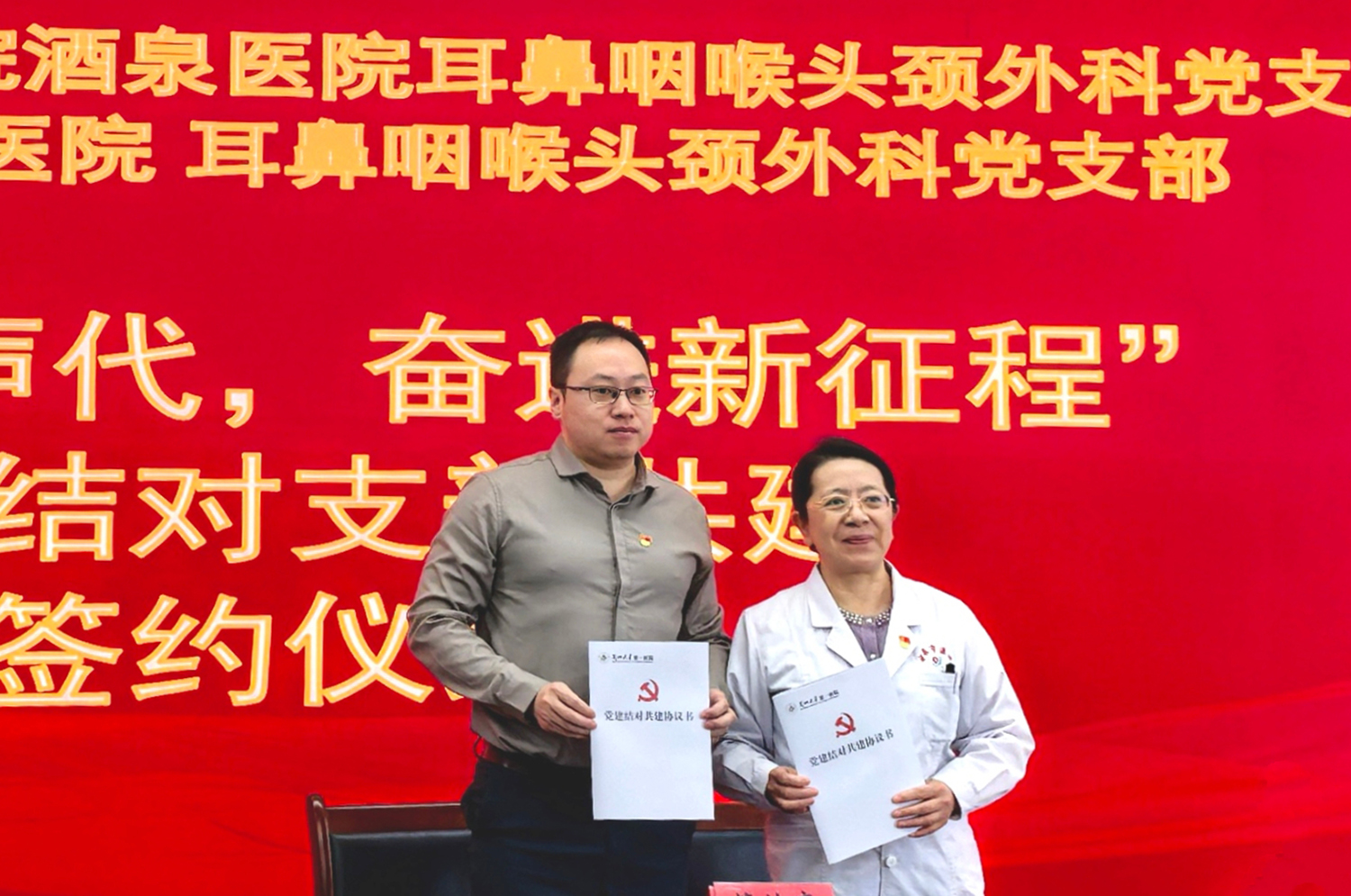 在上海市第一人民医院酒泉医院,兰大一院耳鼻咽喉头颈外科党支部书记桂岩与酒泉医院耳鼻咽喉头颈外科党支部书记张琼签订党建结对共建协议,明确共建目标与实施路径,并通过理论学习联学、主题党日联办、志愿服务联动等方式,构建“资源共享、优势互补、协同发展”的党建工作新格局。