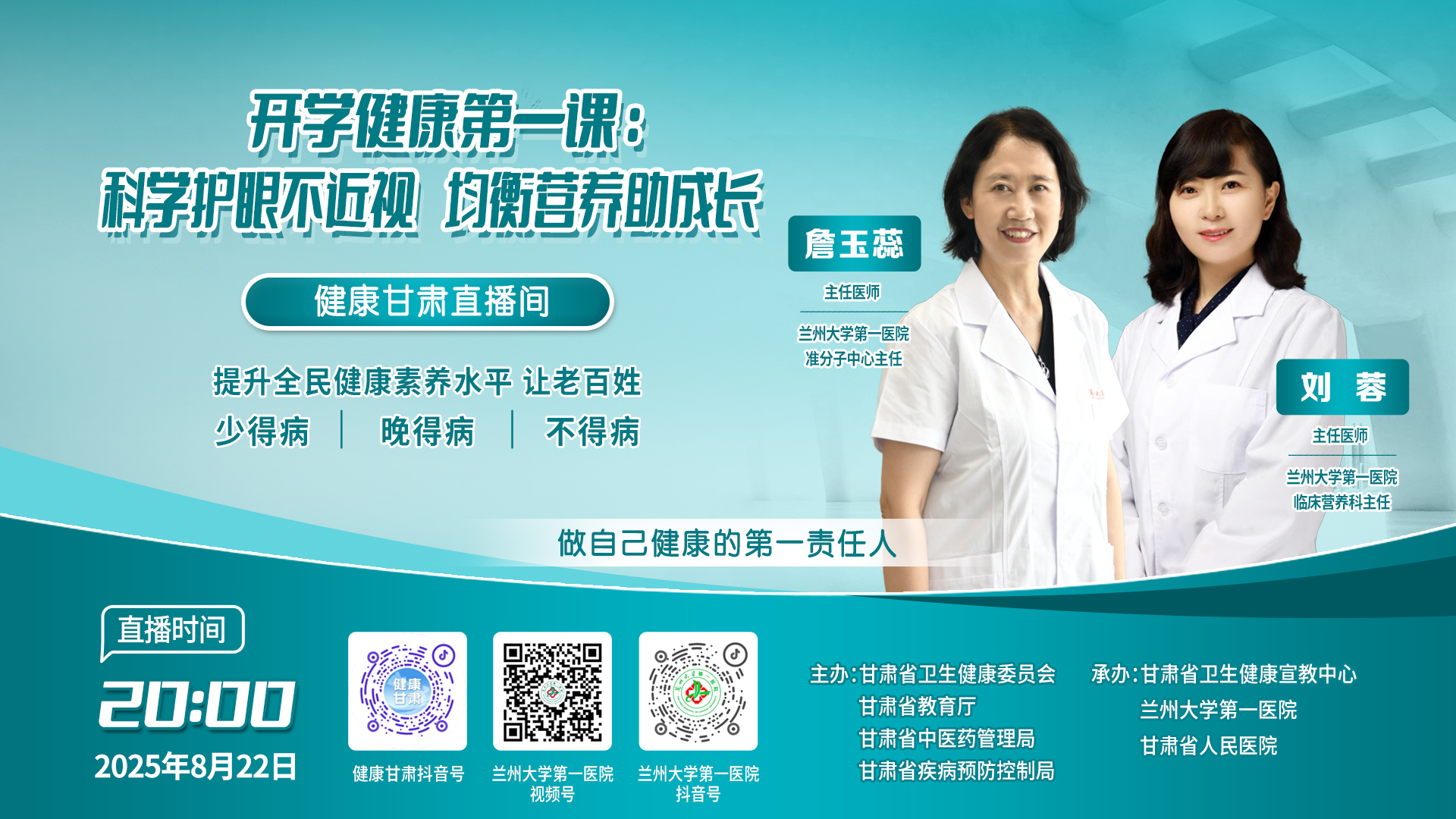 8月22日晚20:00,甘肃省卫生健康委联合省教育厅、省中医药管理局、省疾控局,在“健康甘肃”抖音号推出“开学第一课”健康科普直播,主题为“科学护眼不近视 均衡营养助成长”。
