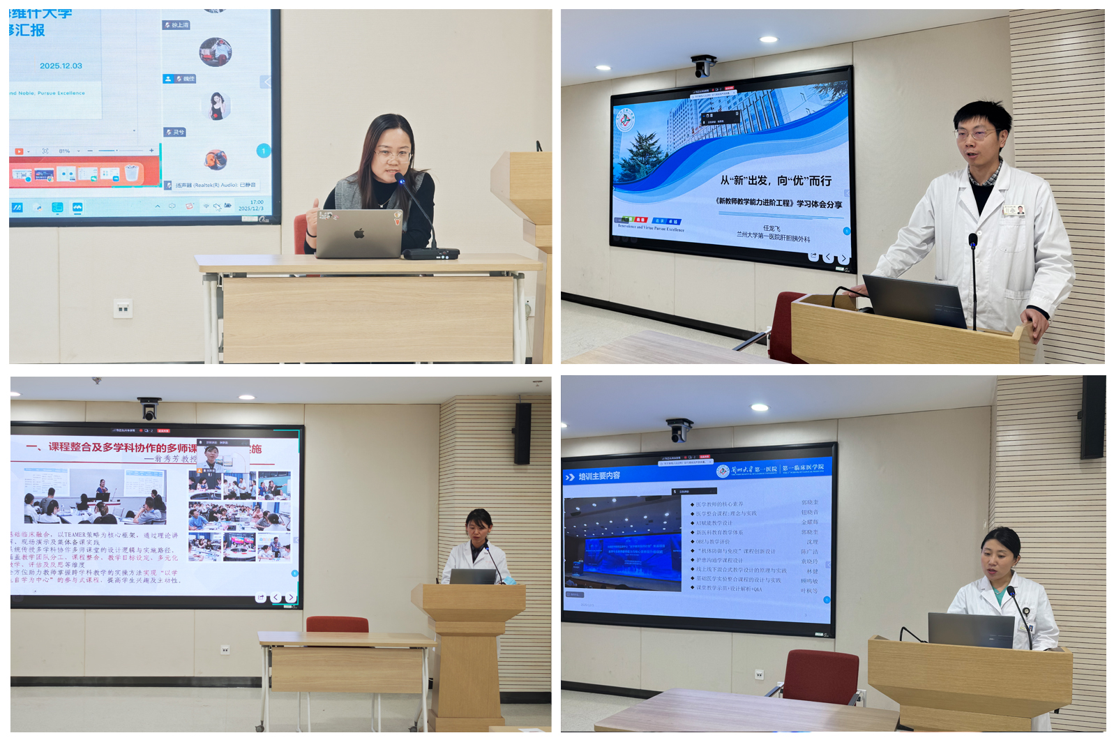 为深化临床医学教育教学改革,加强师资队伍建设,实现“一人受训,全员受益”的培训成效。12月3日,兰州大学第一医院(第一临床医学院)教务处在门诊楼第七会议室,举办“立德树人 踔厉前行”临床医学教师教学能力提升系列培训(第二十一期)—2025年赴外培训教师学习成果分享交流会。培训由教务处处长常桂霞主持,临床教师、教学管理人员等共计40人线上线下参与活动。