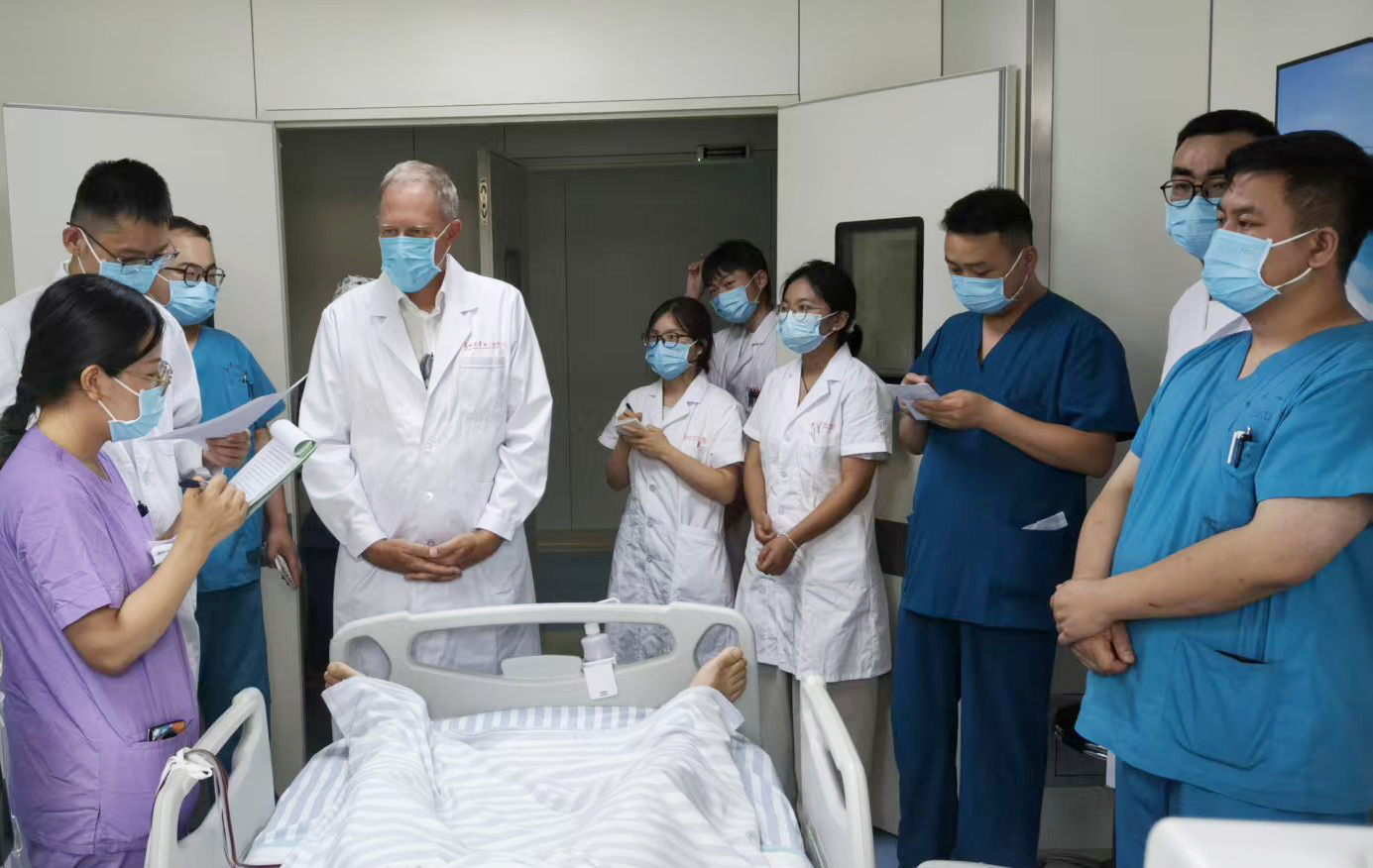 交流期间,Waydhas教授同兰大一院急诊科、EICU主任刘丽平教授团队进行医疗、护理疑难危重症病例讨论交流,进一步优化急危重症患者诊治及护理流程。同时,Waydhas教授在EICU开展疑难病例教学查房及科研项目指导,分享临床研究经验,对课题设计、研究方案及研究成果等方面给予积极评价,对后续研究开展提供建设性意见。
